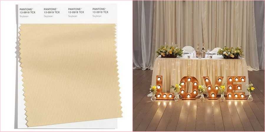 В переводе на русский звучит как «Соя». Теплый, светлый, мягкий, простой, но в то же время элегантный и утонченный бежевый тон станет замечательной находкой для декорирования классического свадебного торжества.