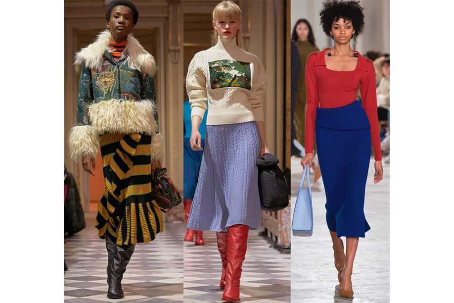 В сезон осень-зима уместны юбки из пряжи средней длины и спускающиеся чуть ниже колена. Такая длина позволяет легко комбинировать модели с рубашками, футболками и блузками. Не менее стильно смотрятся вязаные юбки с пуловерами, свитшотами, свитерами и водолазками.