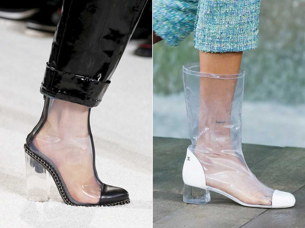 Среди новинок – использование пластика (например, силикон, ПВХ). Материал легок и прозрачен, не пропускает воду, что делает его весьма привлекательным при создании сапог, туфлей. Некоторые дизайнеры не настолько смелы, чтобы делать модели полностью прозрачными. Поэтому они ограничиваются лишь добавлением отдельных прозрачных элементов (например, линия подъёма, ремешок, каблук).