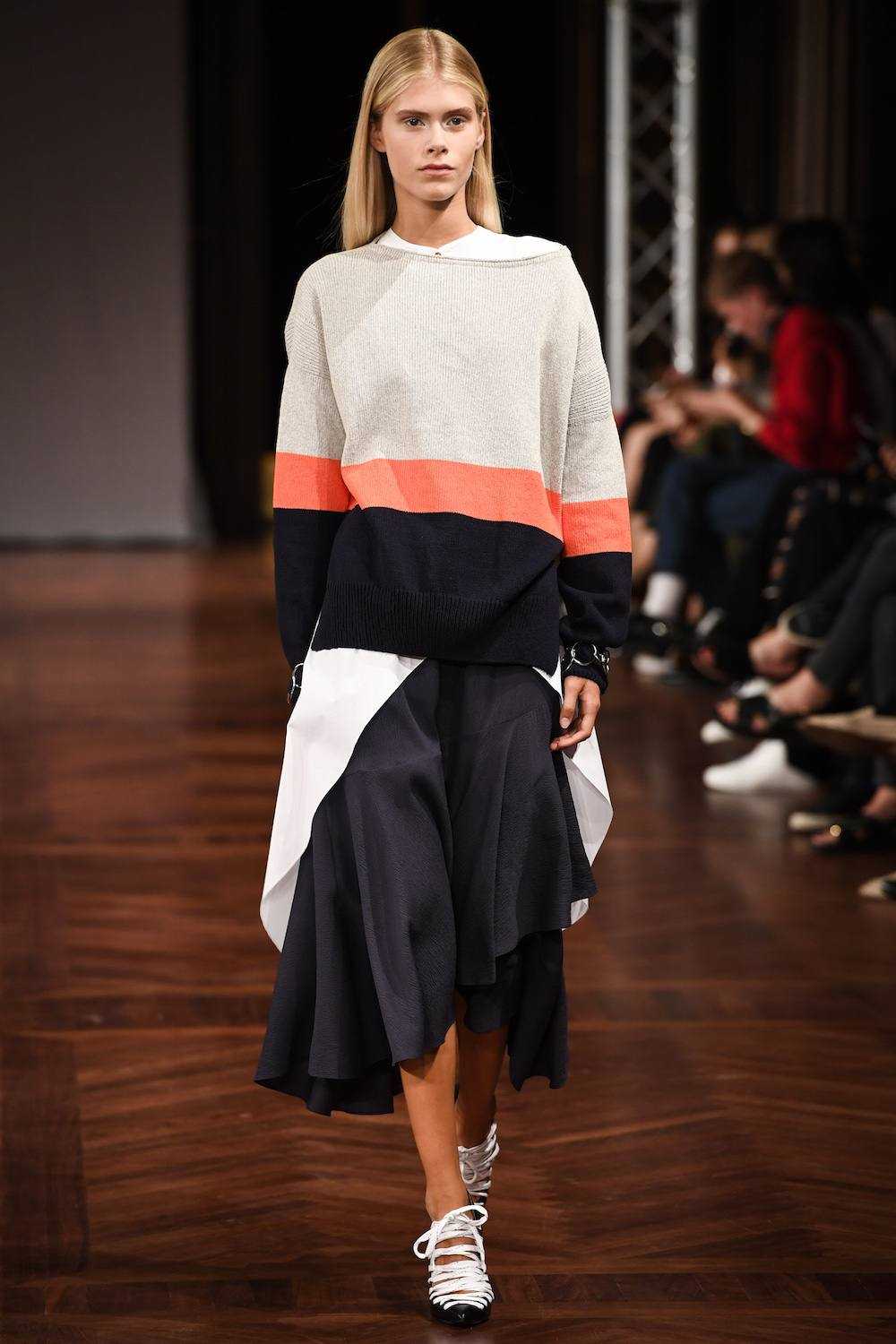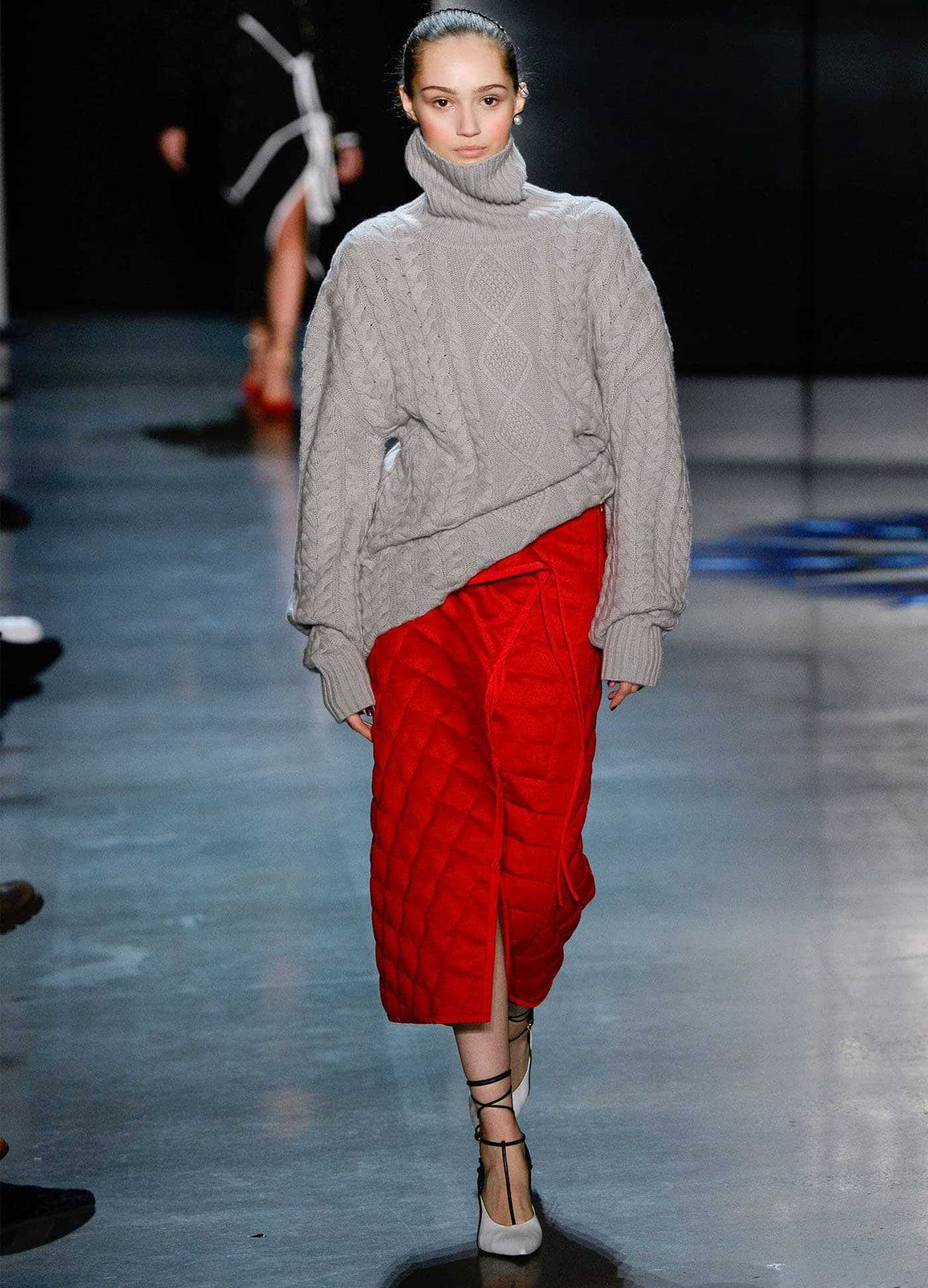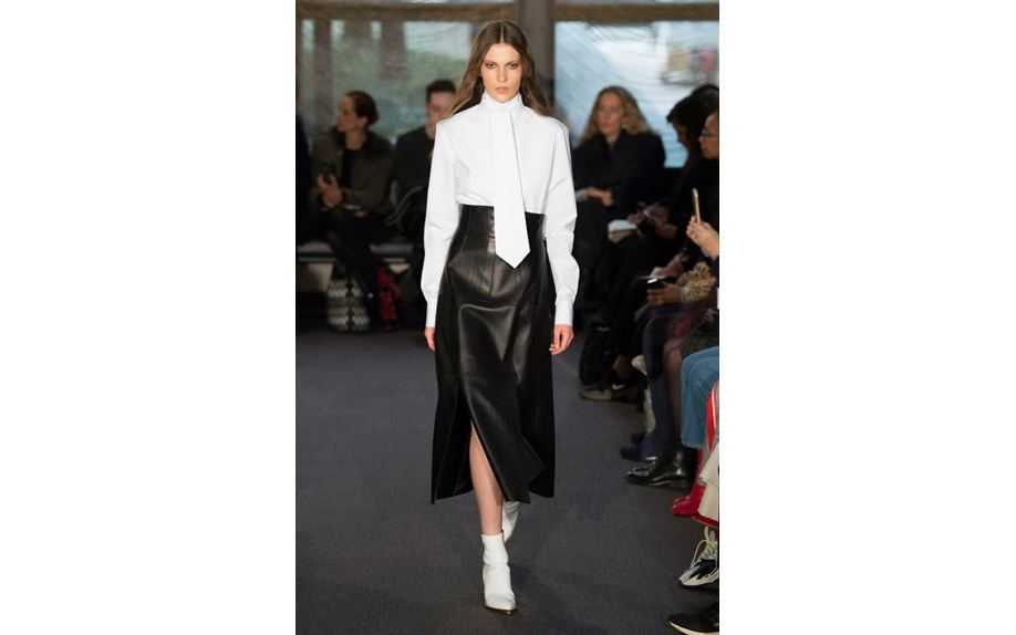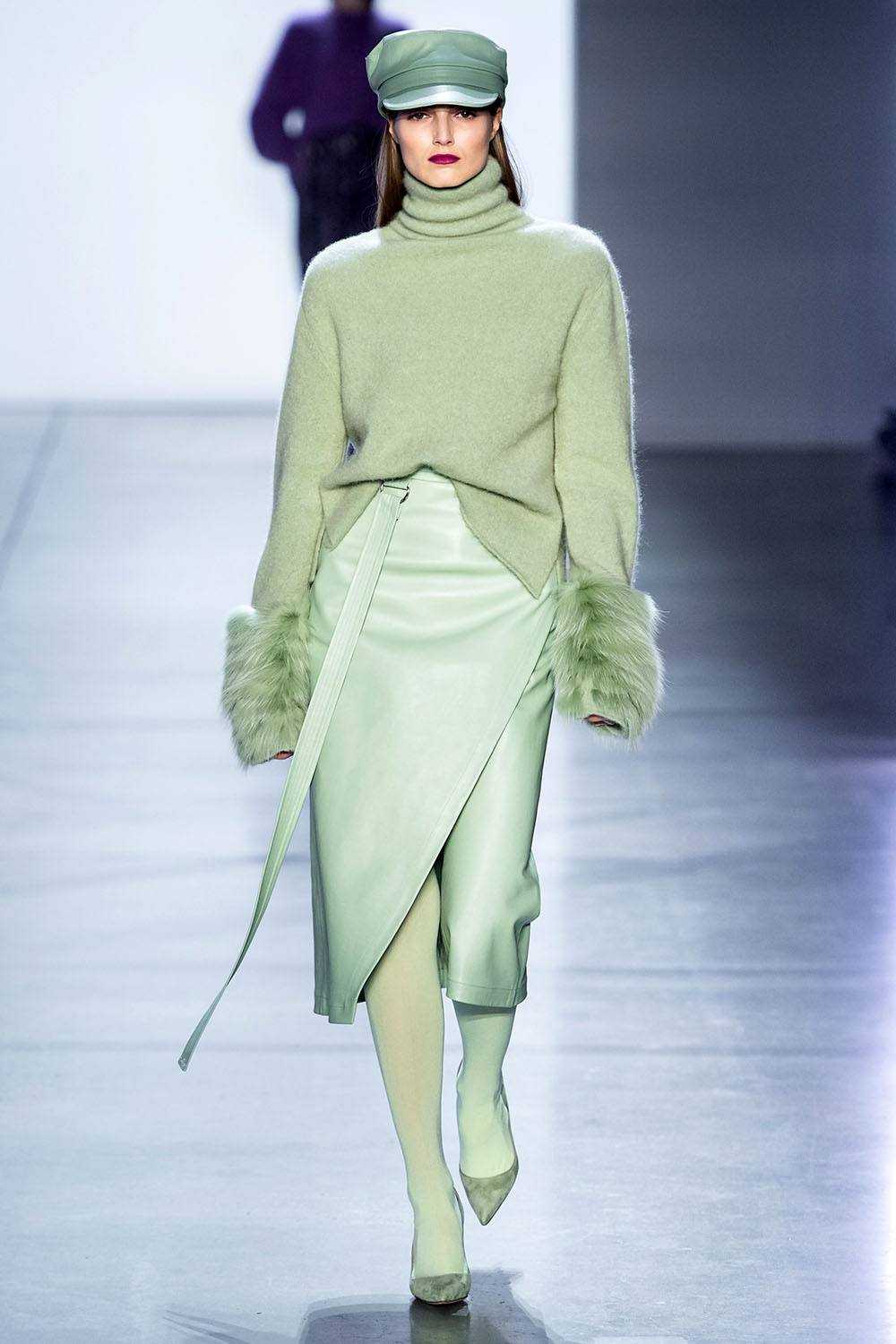 Бренд Tibi тоже выступает за однотонность. Этот образ подходит реальной жизни: ему будет рада и учительница, и студентка, и менеджер, и юрист. Уютный вязаный свитер уравновешивает несколько агрессивную кожаную юбку. Сочетание для практичных эстетов!