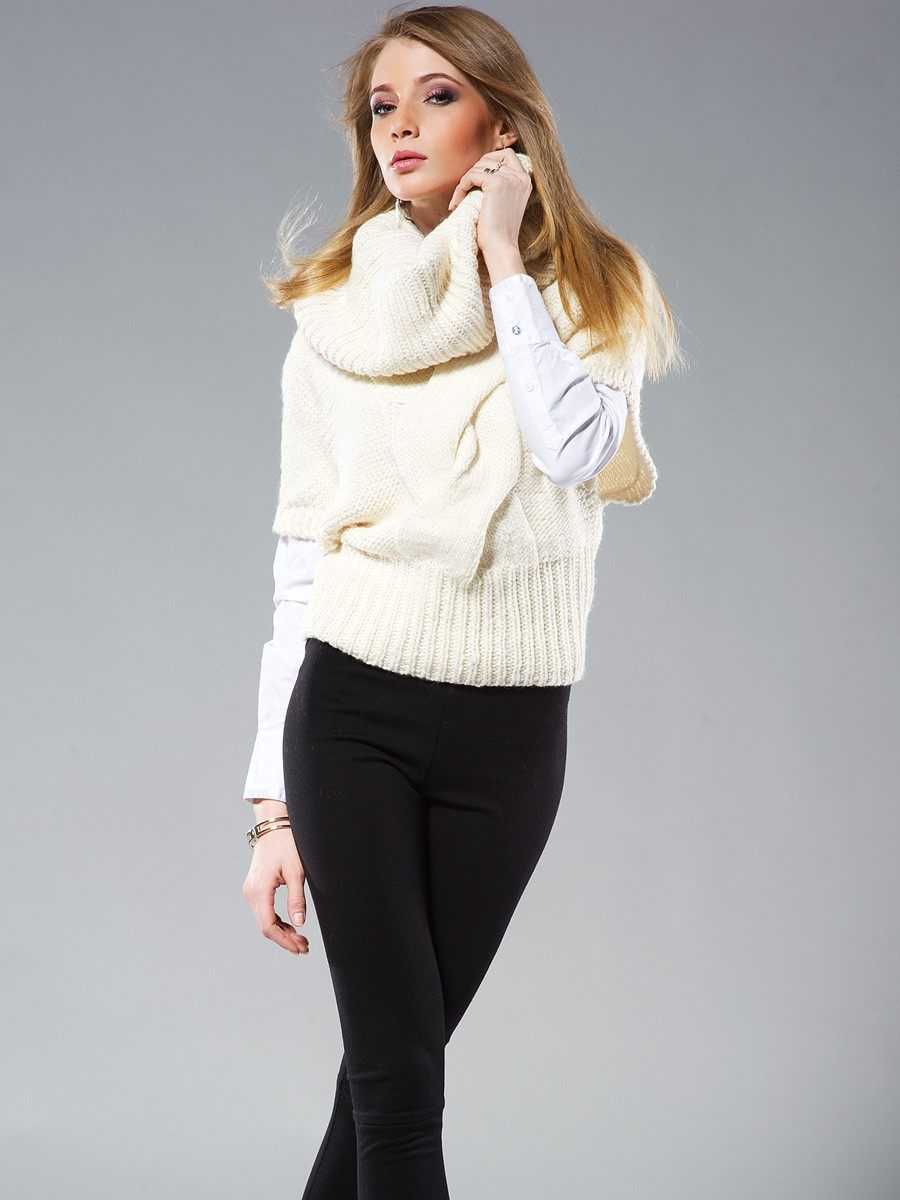 Вы можете создать трендовый многослойный образ, надев под низ кофты рубашку подходящего цвета. Универсальный вариант – белый, к тому же светлая рубашка сделает образ более деловым и элегантным. Также объемные модели надевают на платья.