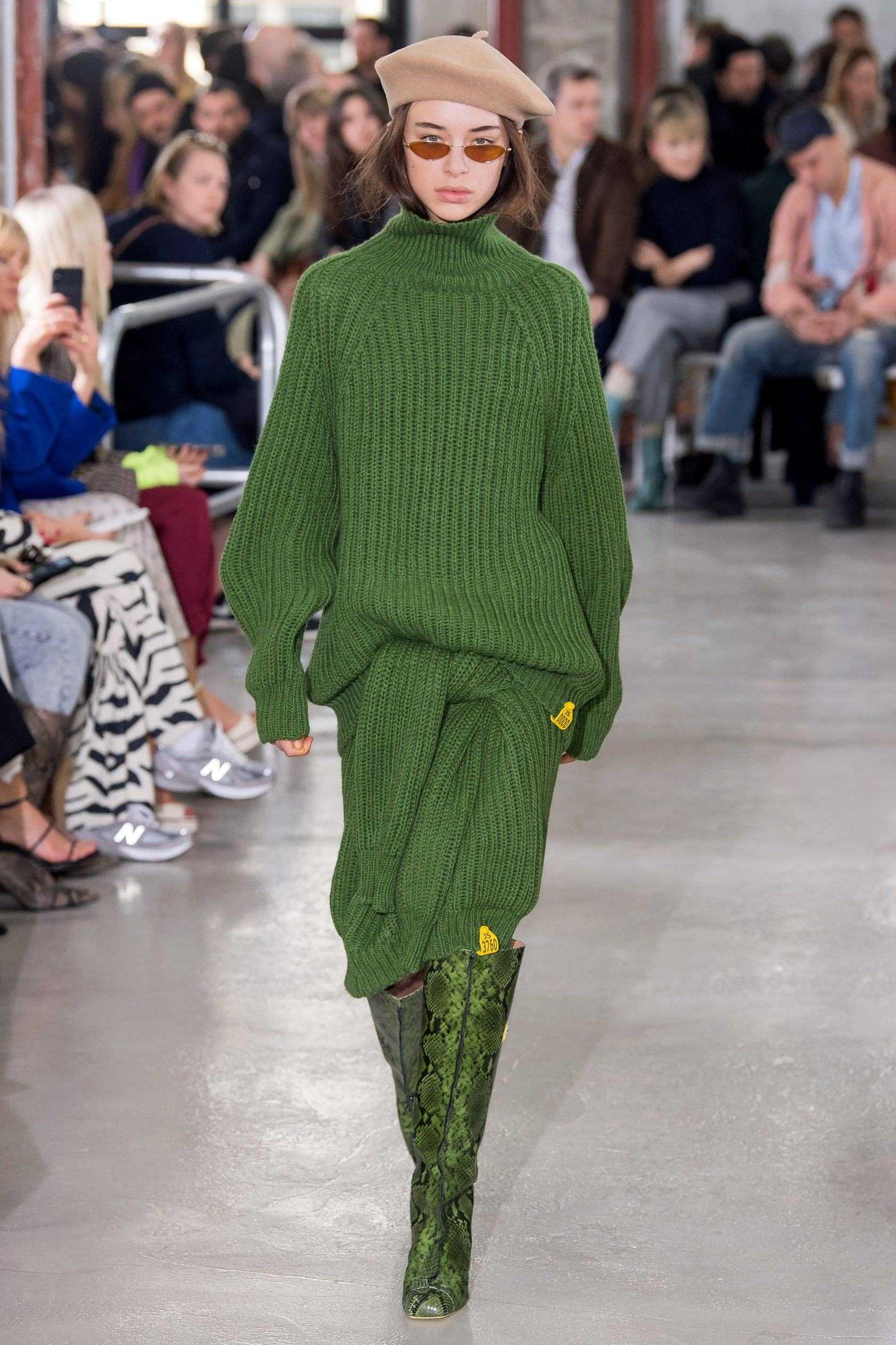 Бренд Marco de Vincenzo демонстрирует не просто оверсайз, но блэк оверсайз. Вариант для тех, чей цвет настроенья чёрный. Благодаря светлой окантовке на рукавах, воротнике и нижнем крае образ получается не слишком скучным, но юбка подобрана строго в цвет свитера.