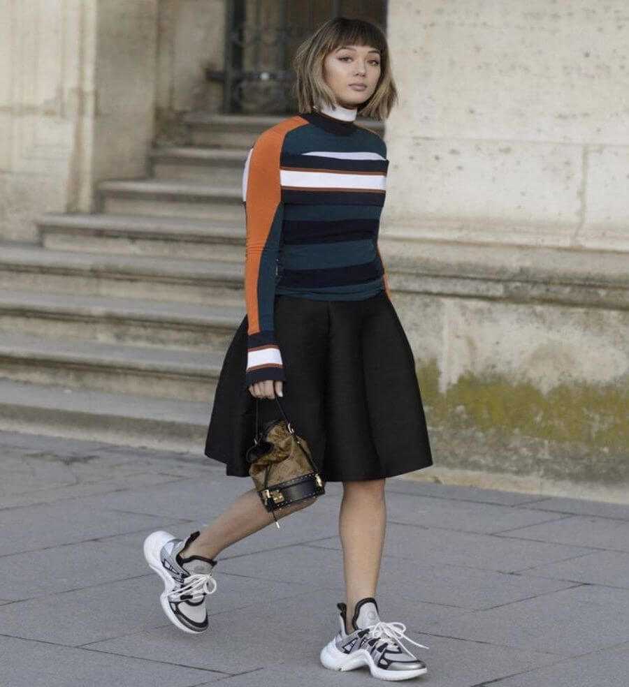 Но при создании аутфита акцентировать внимание нужно на одном элементе – кроссовках или платье. Он должен быть ярким, в то время как второй элемент выполнен в нейтральных тонах