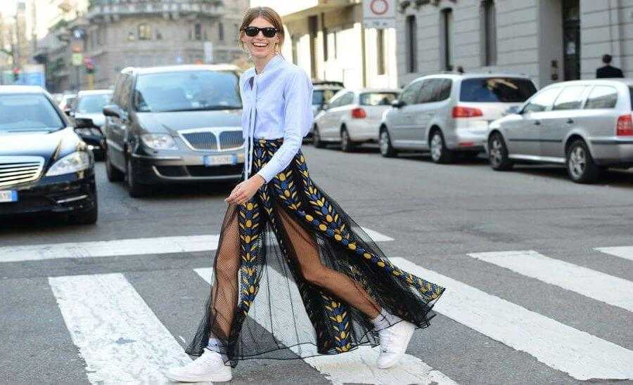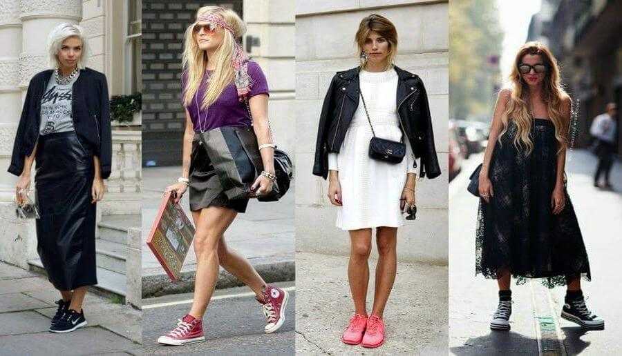 Не каждая девушка решается носить кроссовки с платьями или юбками. Но в новомодных направлениях объединение изысканных вещей со спортивными элементами обуви смотрится гармонично.
