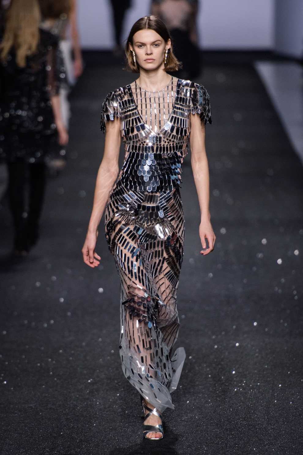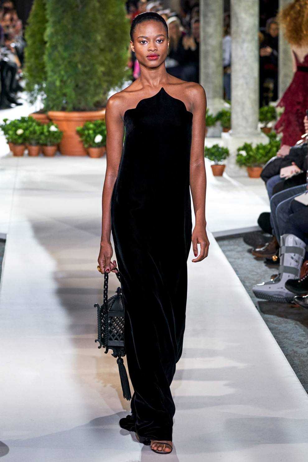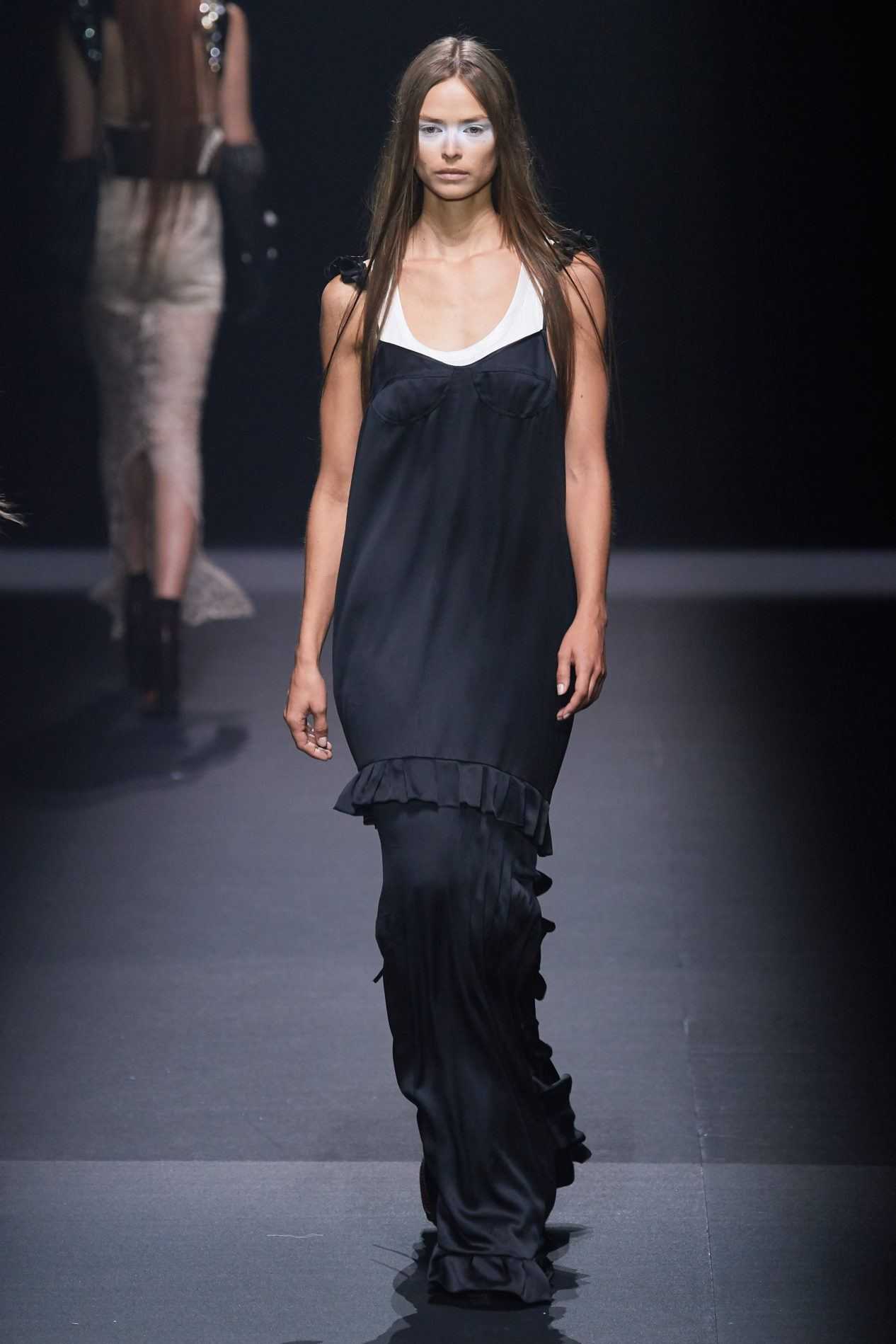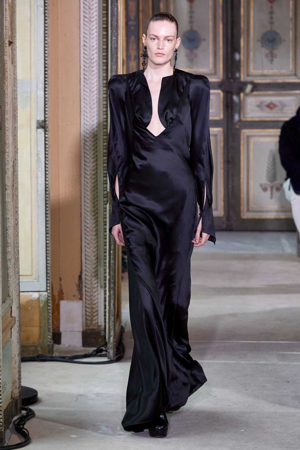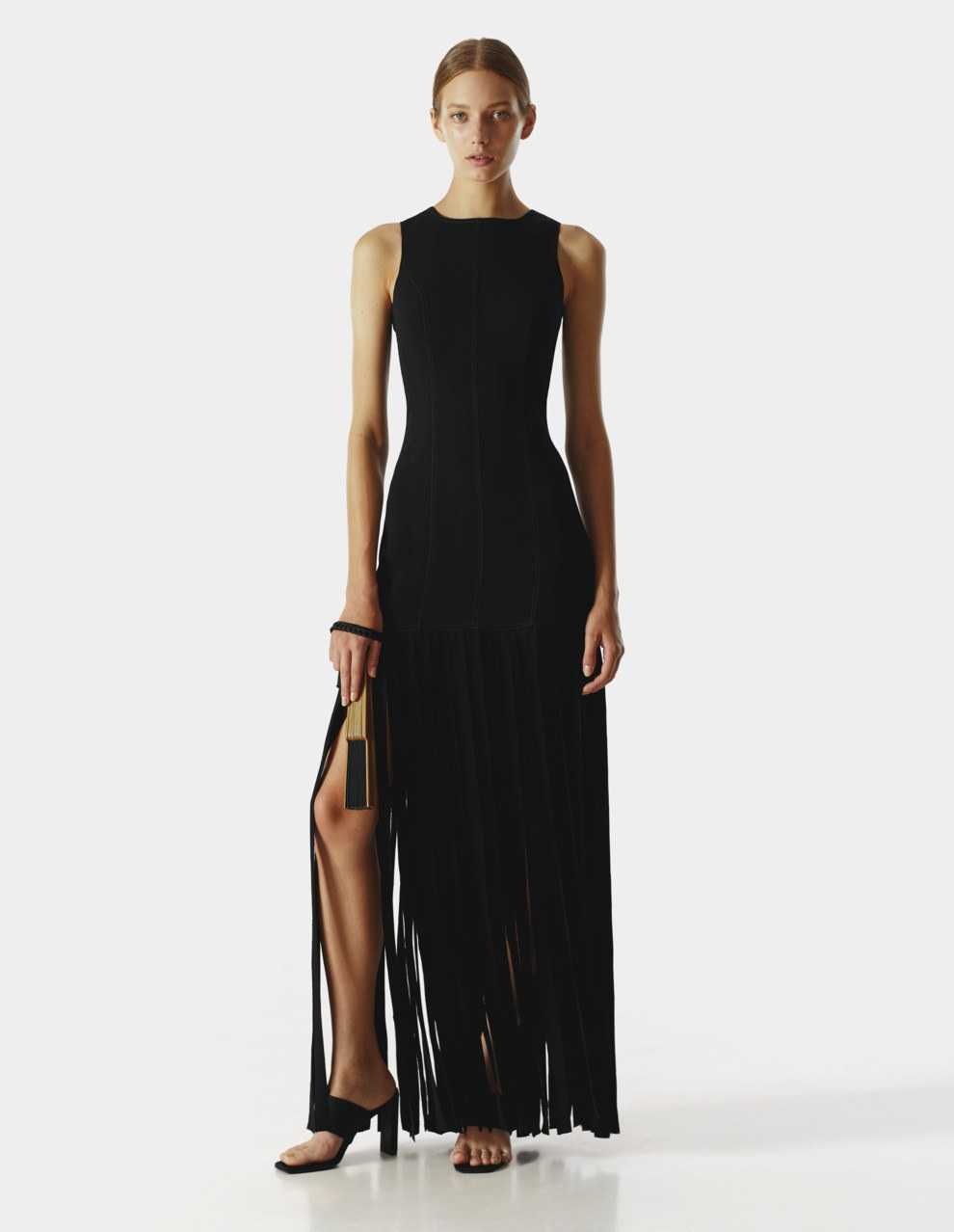 Alberta Ferretti продемонстрировали черный тотал-лук из платья с длинной бахромой и лаконичного полупальто.