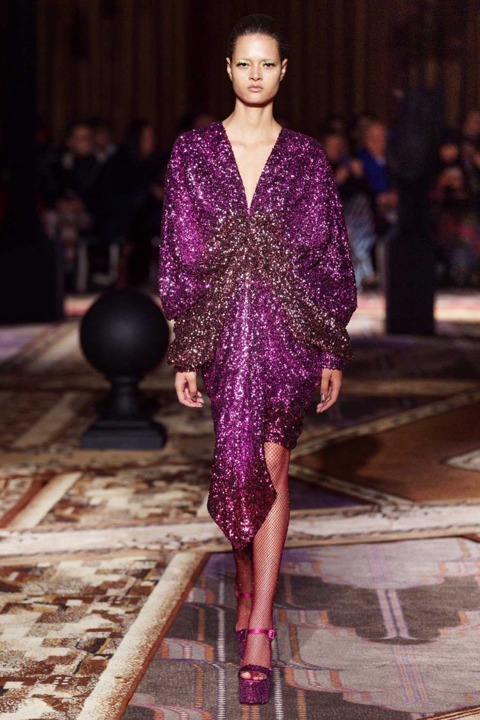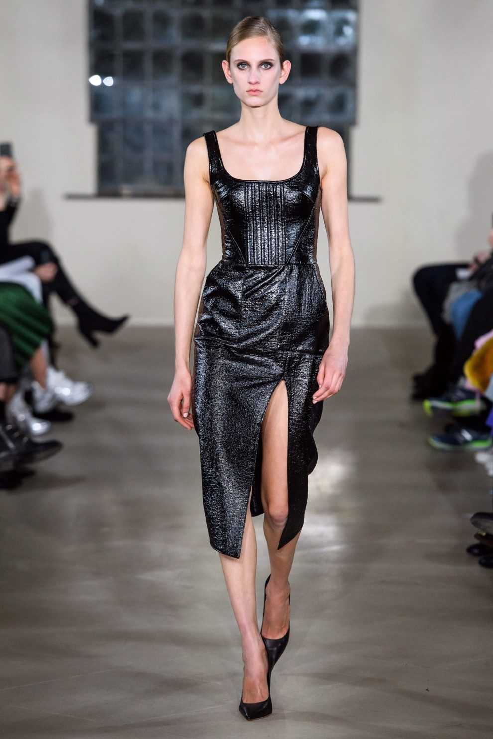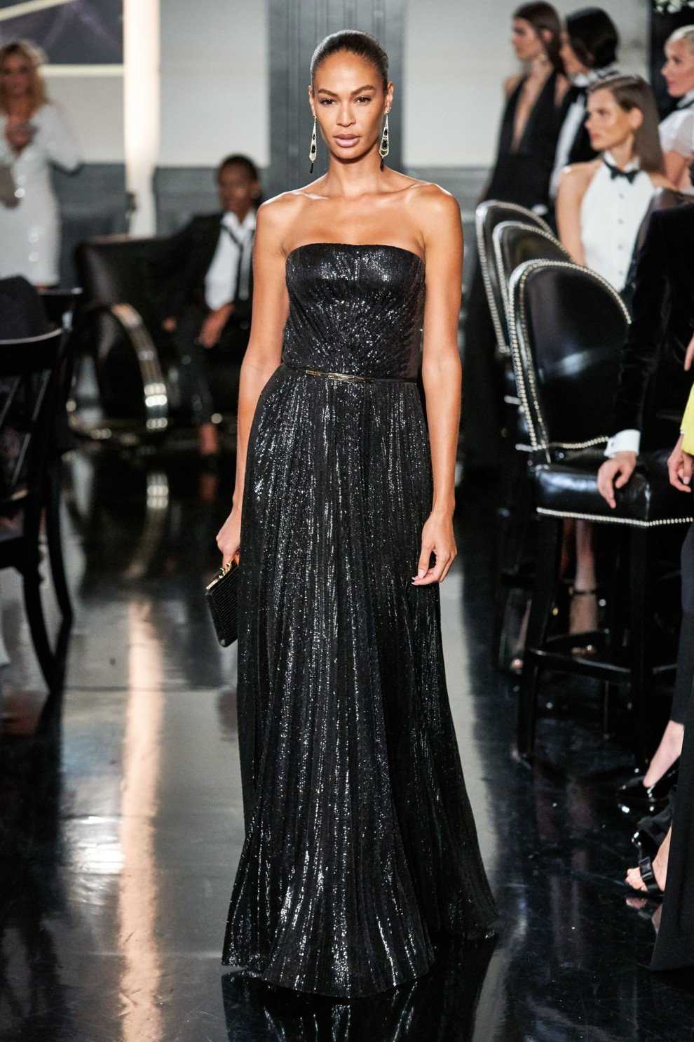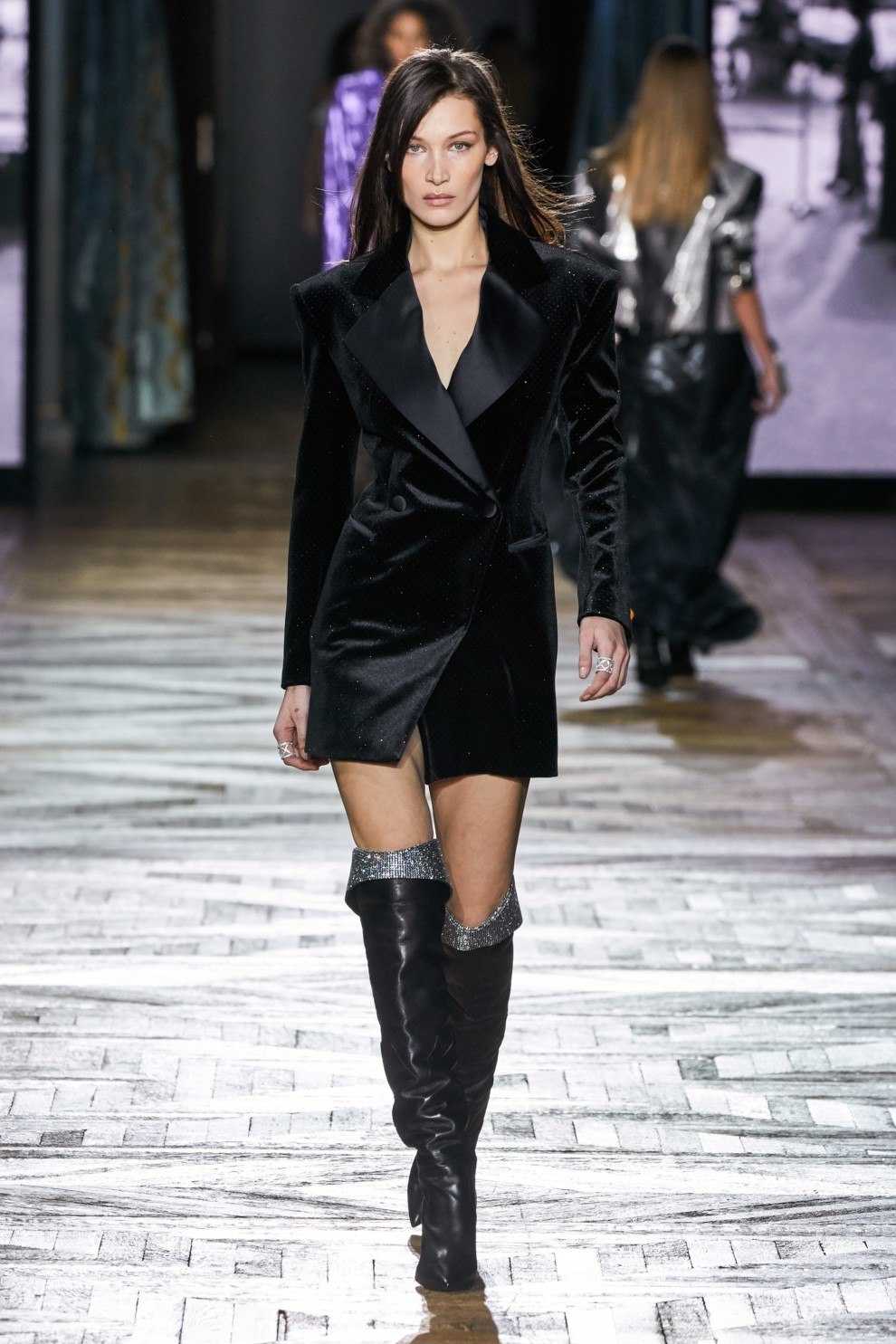 Alberta Ferretti продемонстрировали черный тотал-лук из платья с длинной бахромой и лаконичного полупальто.