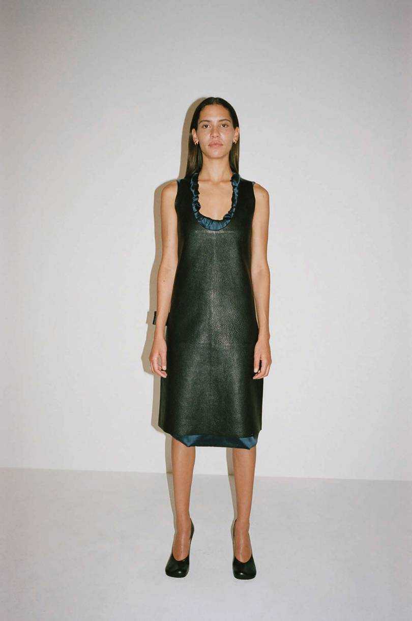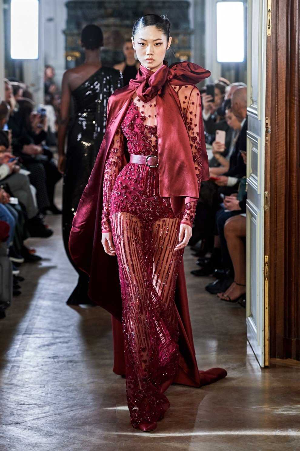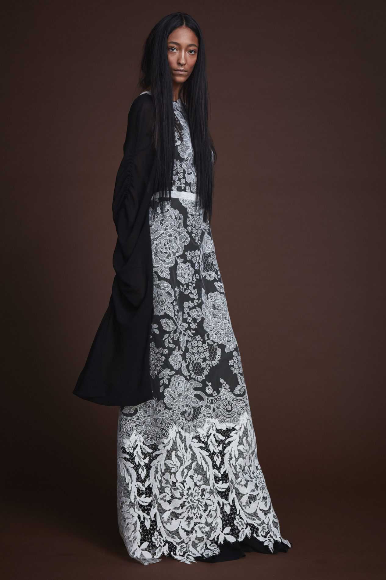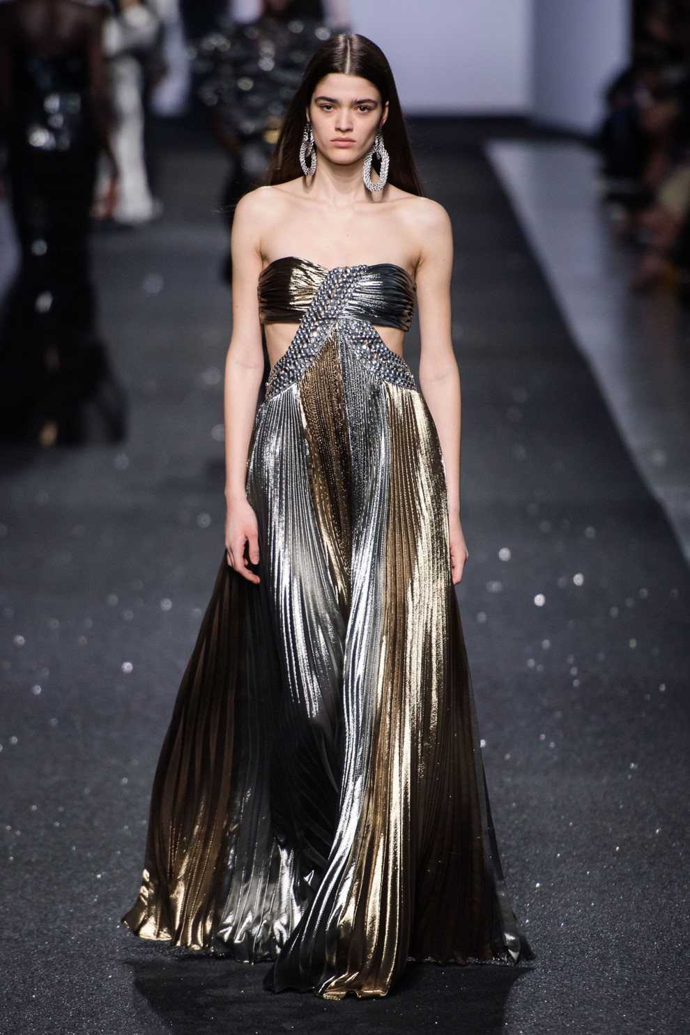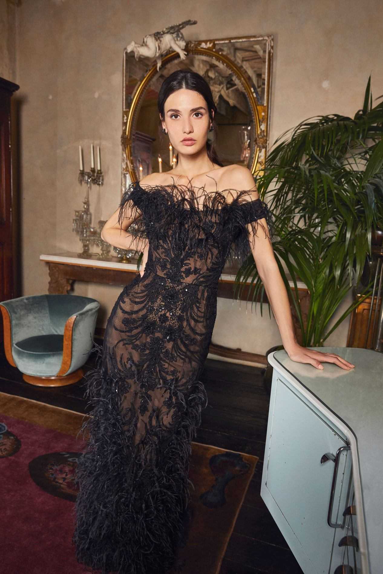 Alberta Ferretti продемонстрировали черный тотал-лук из платья с длинной бахромой и лаконичного полупальто.