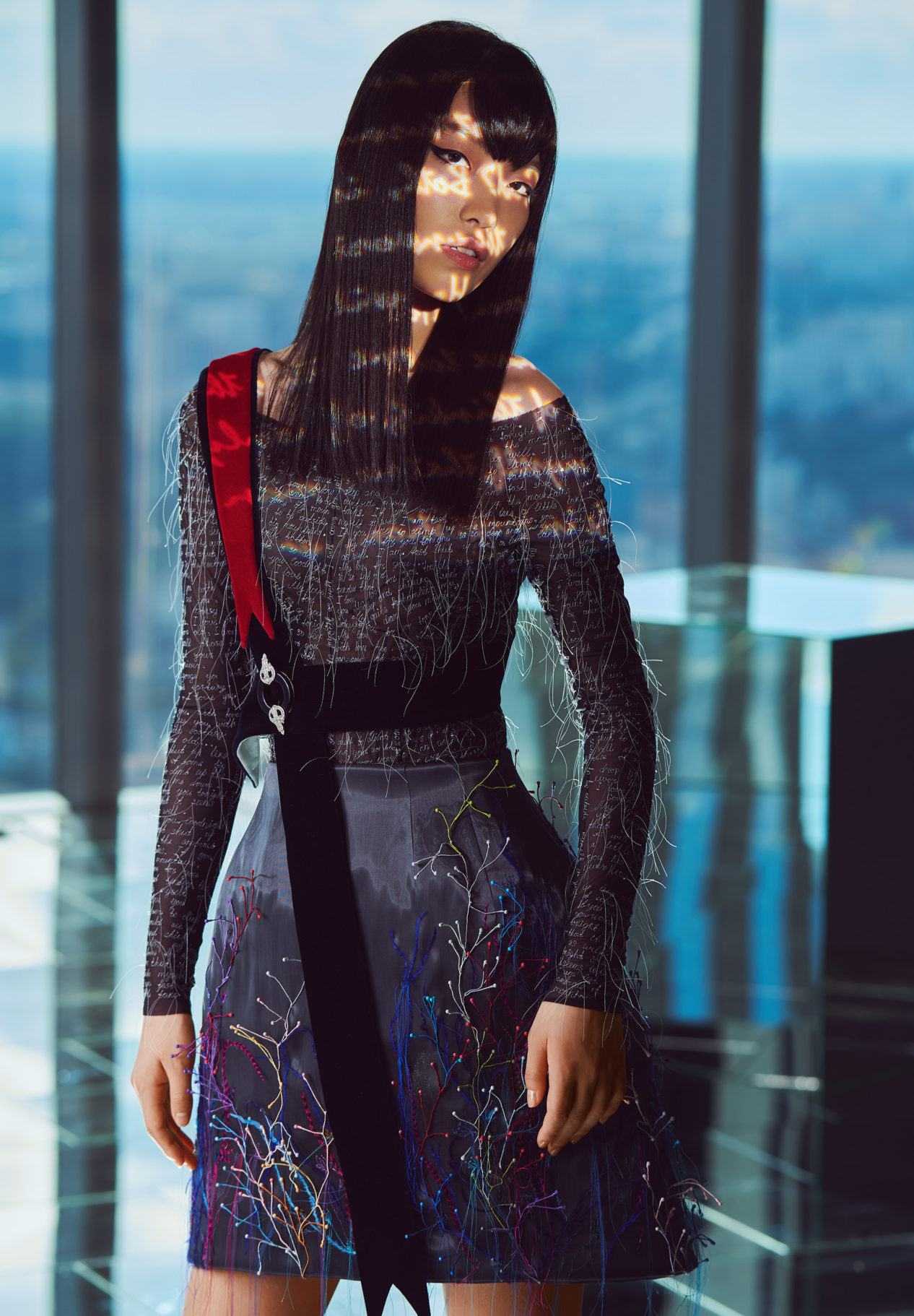 У Prada бахромой украшена длинная юбка, к ней подобран жакет оверсайз из плотной ткани.