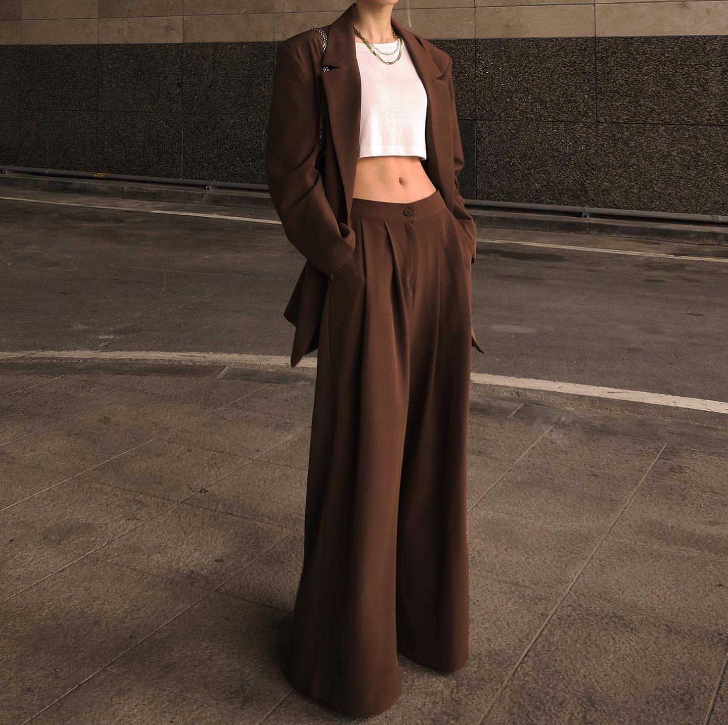 Женский пиджак — идеальный вариант, если блузка классическая, похожа на деловую рубашку. Однако, это уже блейзер. Пиджаком принято называть деловую модель верха в тон низу. При этом совпадает и фактура материалов. А блейзер — может быть любым. Его выбор зависит от стиля лука. Если он дополнен кроссовками, выбирайте прямые джинсы, блузку заправленную в брюки и строгий классический жакет — из шерсти, твида, замши или кожи.