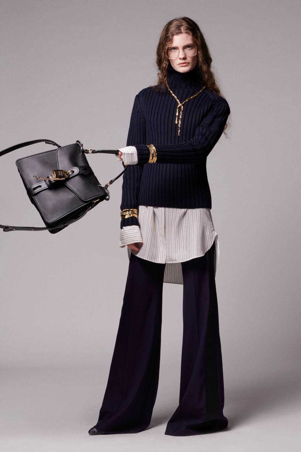 Аутфит от Akris объединил оттенки горчицы, тосканского солнца и дижона. Длинное просторное пальто распахнуто и демонстрирует облегающий свитерок и широкие брючки. Этот образ претендует на звание total look, поскольку сконцентрирован на цвете яркой и острой пряности.