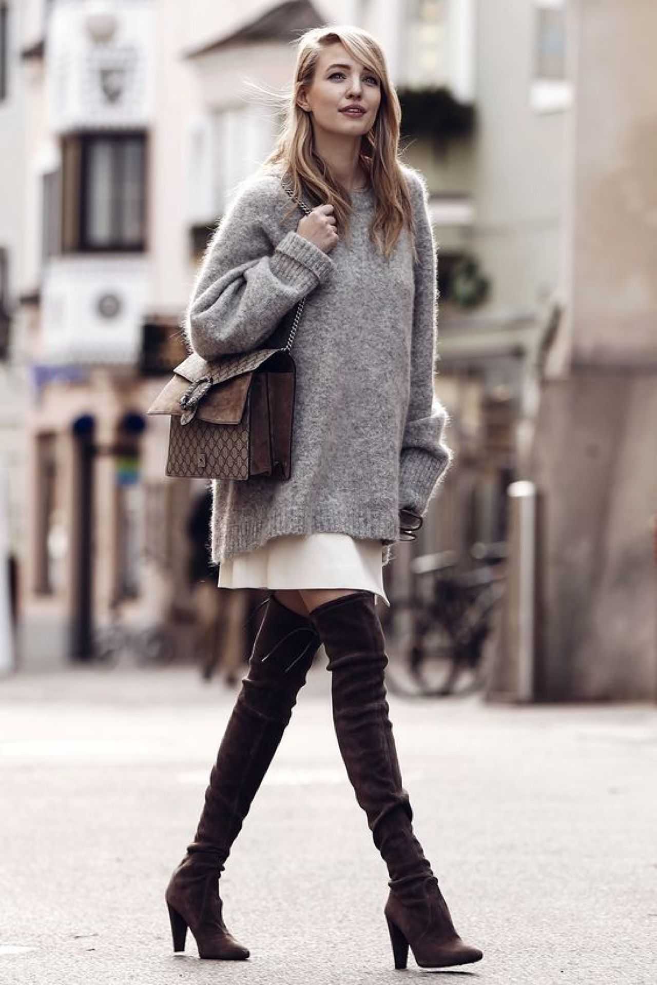 И правильно, объемный свитер дополнит композицию с юбкой-миди, ведь куртки и пальто уже не способны испортить общее впечатление. На ногах прекрасно смотрятся сапоги.