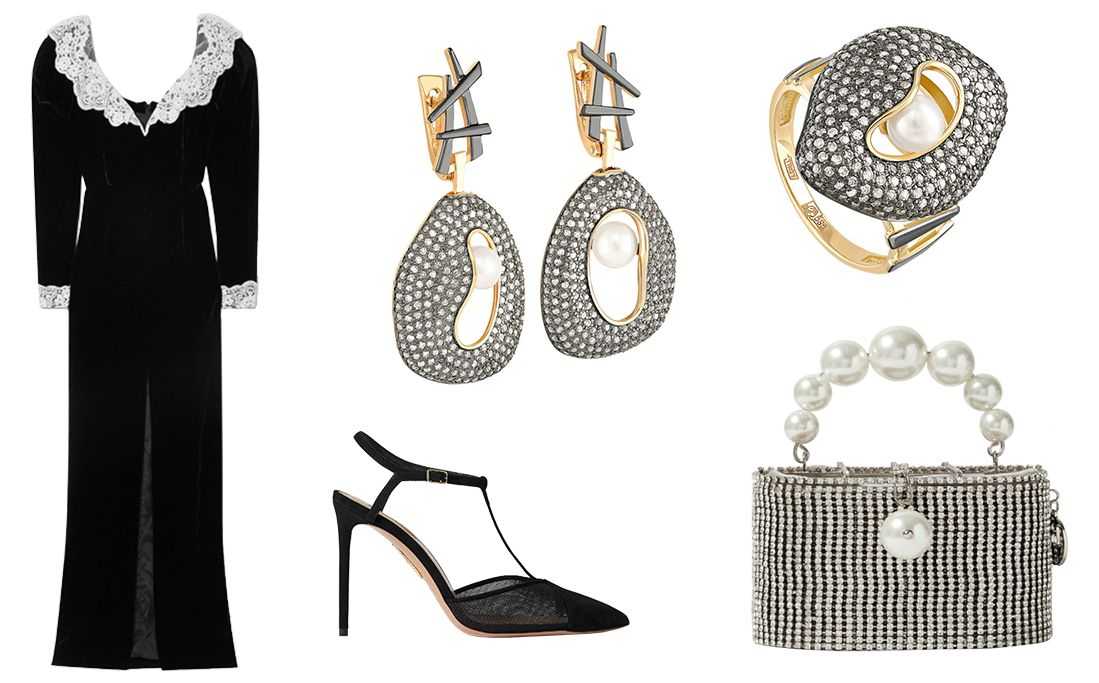 Бархатное платье с воротничком Alessandra Rich, туфли Aquazzura, вечерняя сумка Rosantica, эффектные серьги и кольцо из желтого/лимонного золота с бриллиантами и культивированным жемчугом – все Kabarovsky