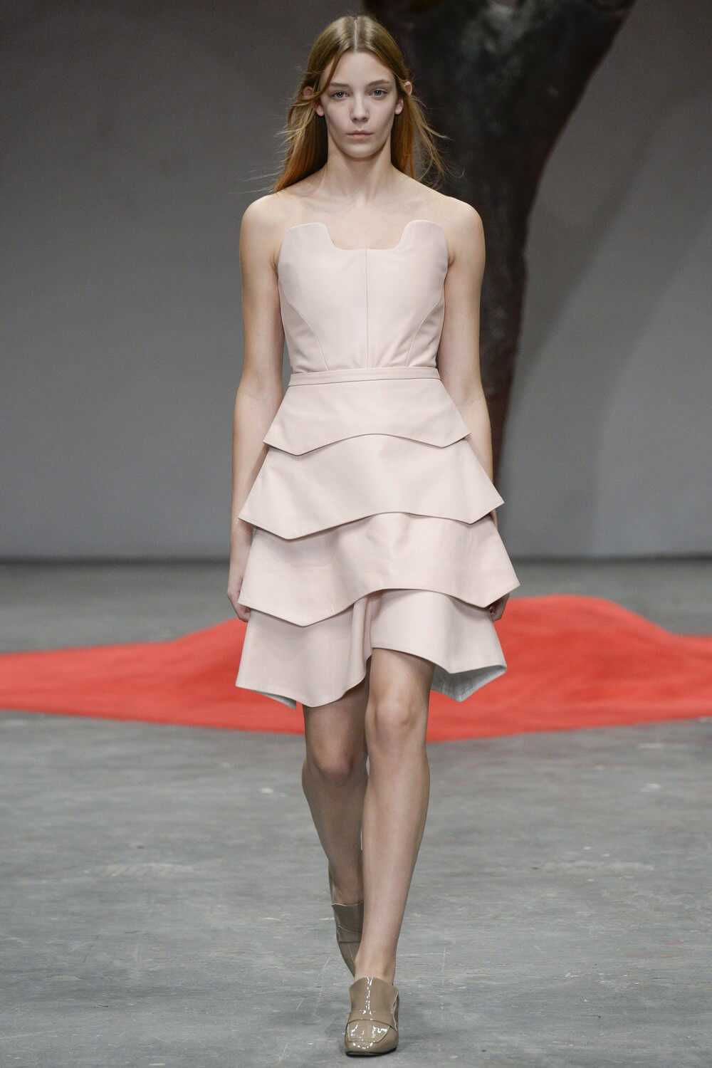 Летняя коллекция от Victoria Beckham представлена в открытых и женственных вариантах. Легкие летние платья с глубокими вырезами декольте и короткими приталенными юбками, платья представлены в несвойственных для дизайнера оттенках розового и желтого.
