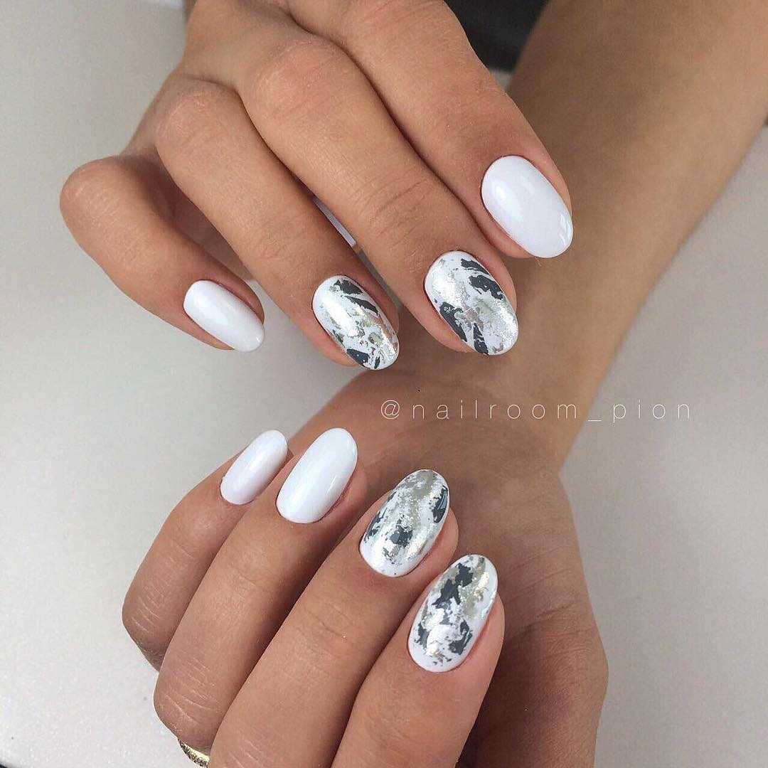 Не все любят белый лак, но если нанести крупные геометрические узоры, объемные камни, либо украсить фольгой, ногтевая пластина будет выглядеть элегантно и изысканно.