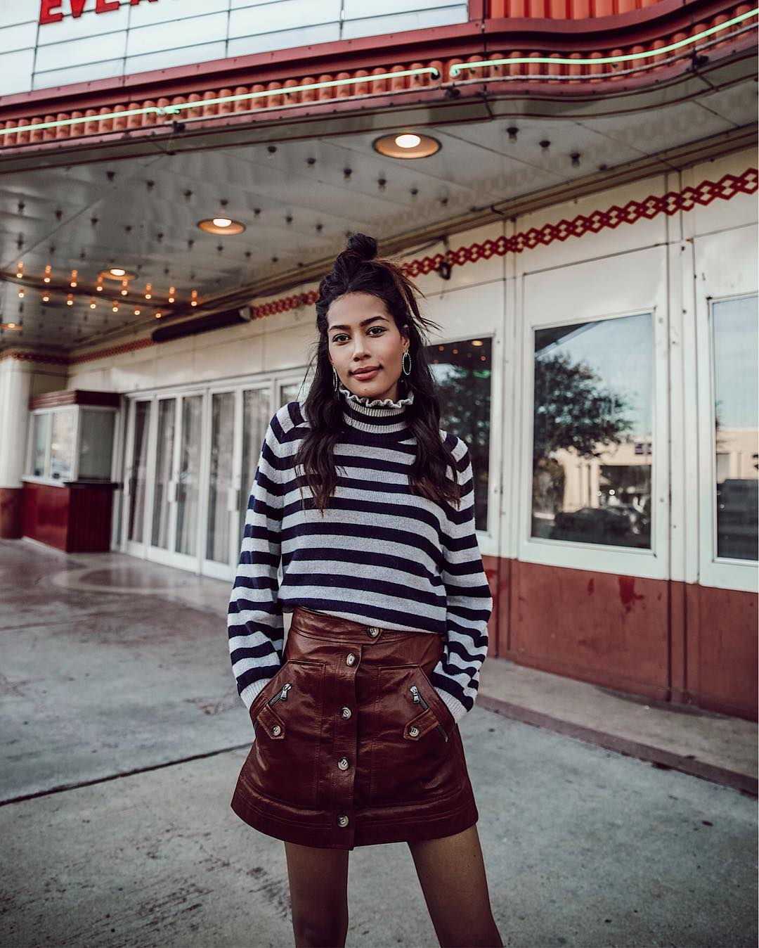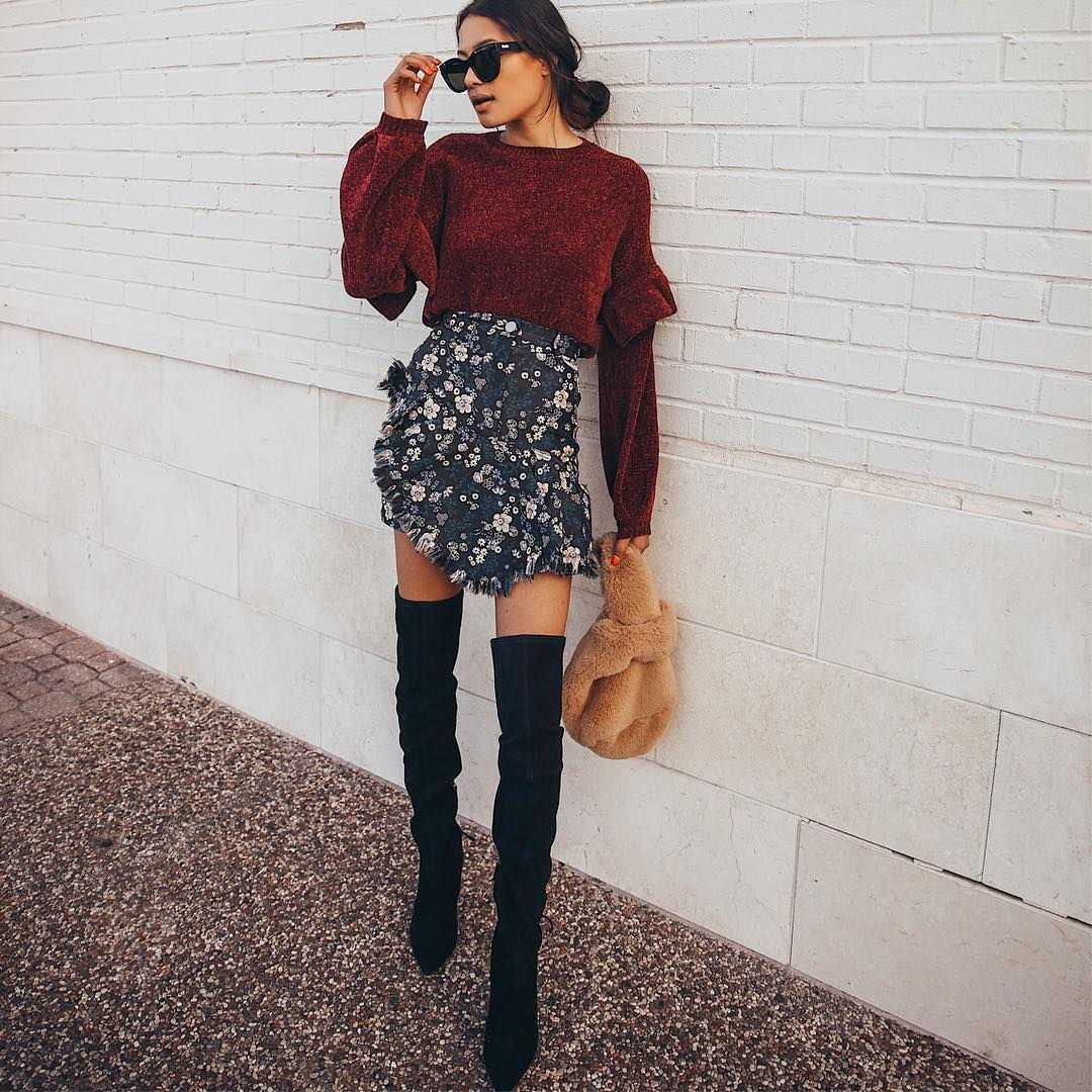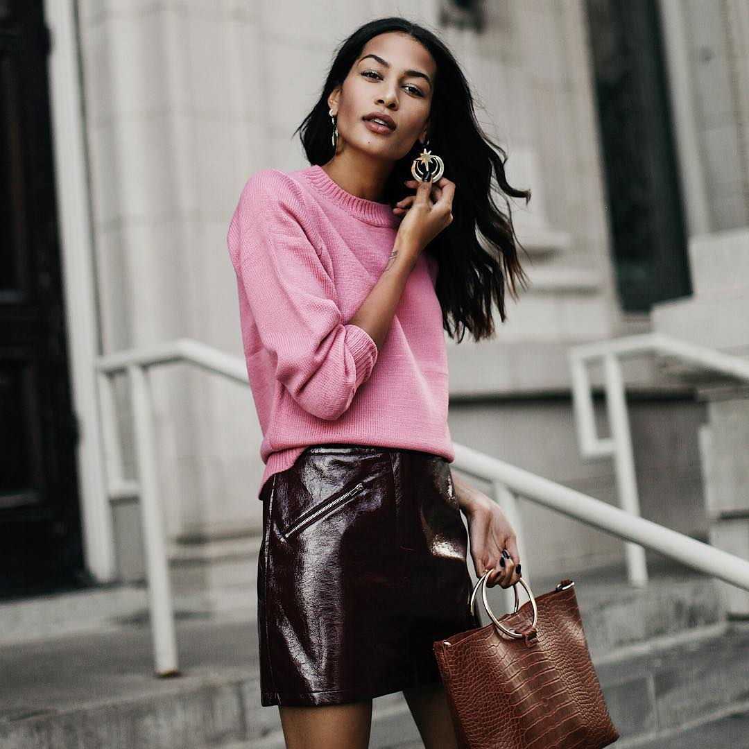 Юбка также идет всем типам фигуры, но «яблокам» и «грушам» стоит выбирать варианты выше колена, а «песочным часам» ‒ с длиной до середины бедер. Носить ее можно с топами, футболками, тонкими водолазками и обувью на высоком каблуке.