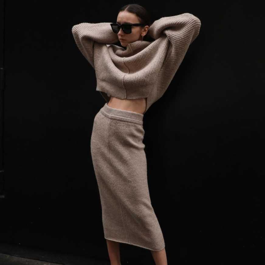 Уместным будет носить зимой подобную юбку миди с модными объемными свитерами.