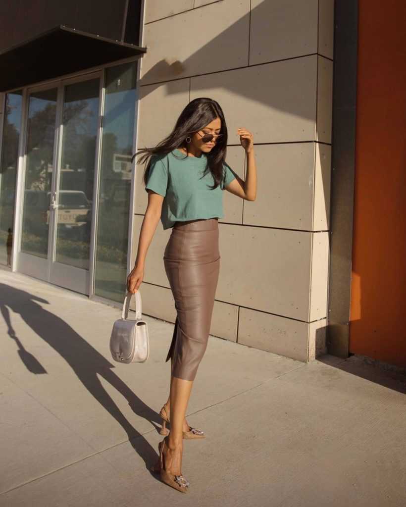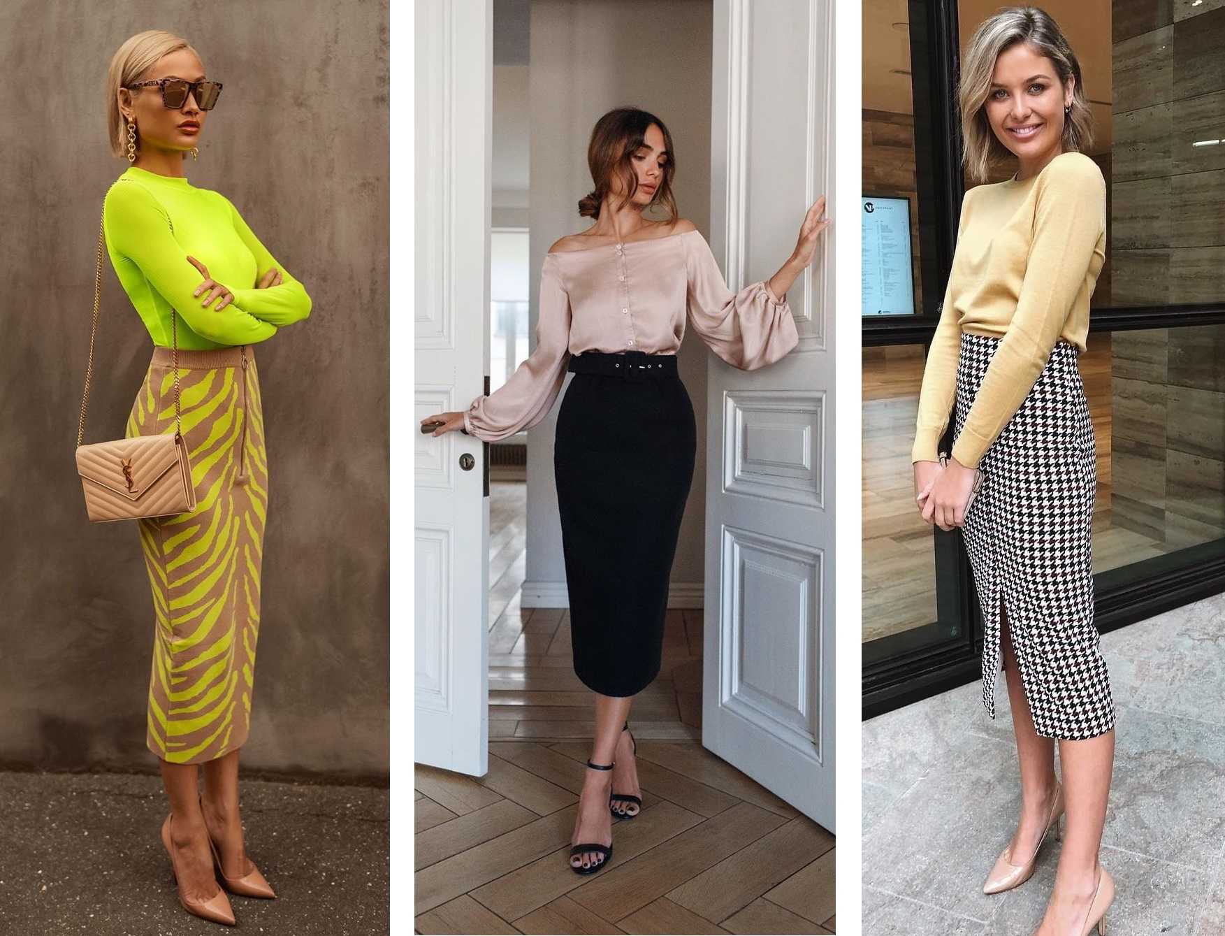 | Миди | Серый, коричневый; прямой, карандаш | Белая рубашка или блузка с длинными рукавами; майка с темным пиджаком | Туфли на каблуке, клатч | Деловой, элегантный |