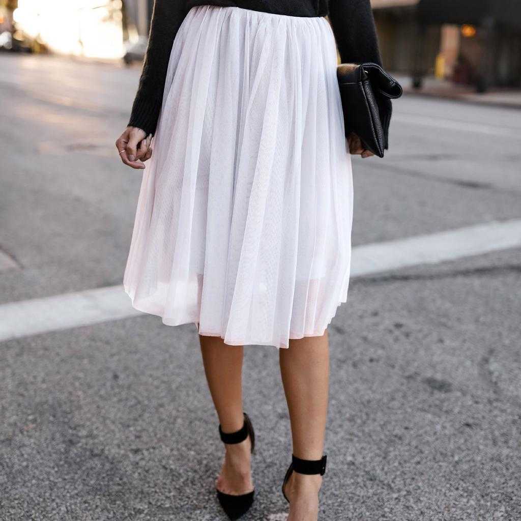 | Миди | Черно-белый; солнце, асимметричный, в складку | Темная водолазка или майка, белая блузка | Открытые туфли на шпильке, клатч | Романтический, повседневный |