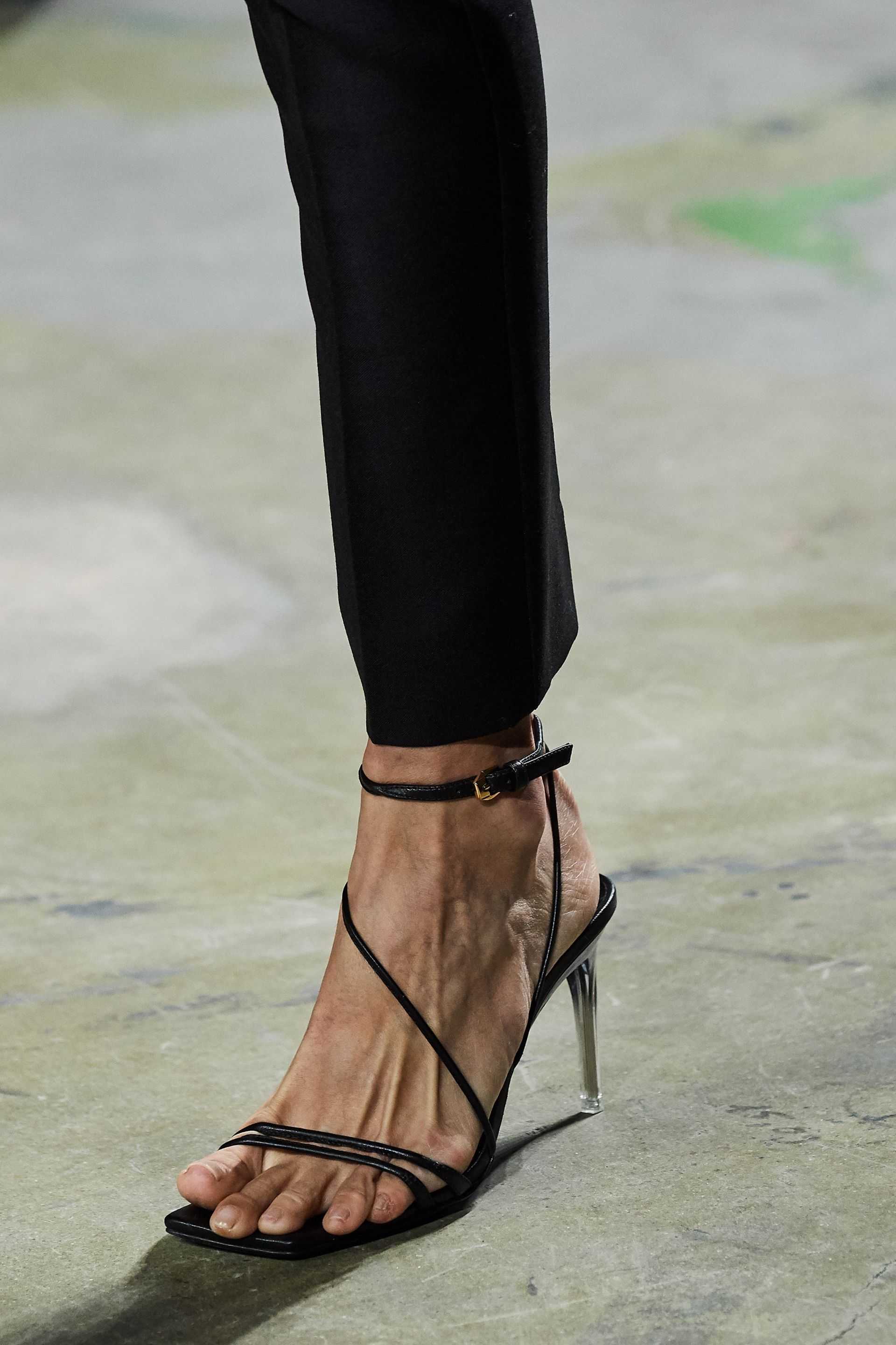 С легкой руки Versace и Giorgio Armani босоножки с тонким ремешком стали ключевыми элементами летнего обувного гардероба – дизайнеры предлагают носить их с трикотажными летними комбинезонами, платьями и строгими юбками-карандаш