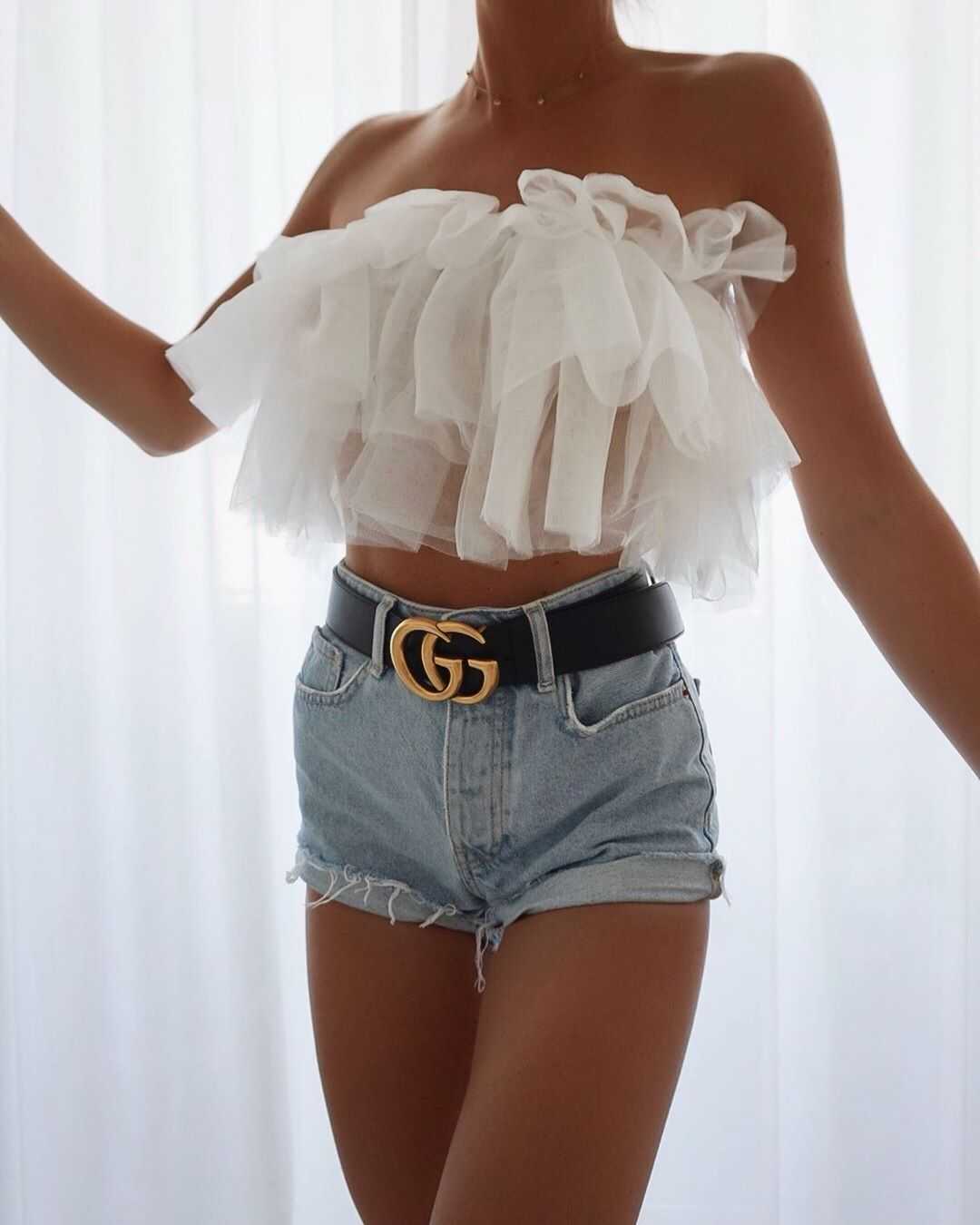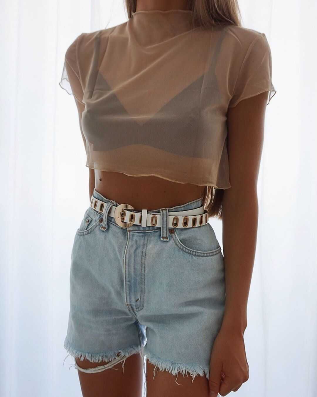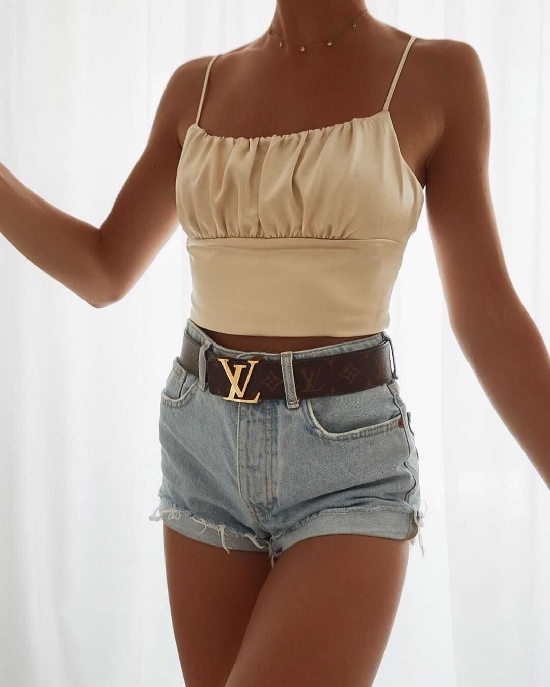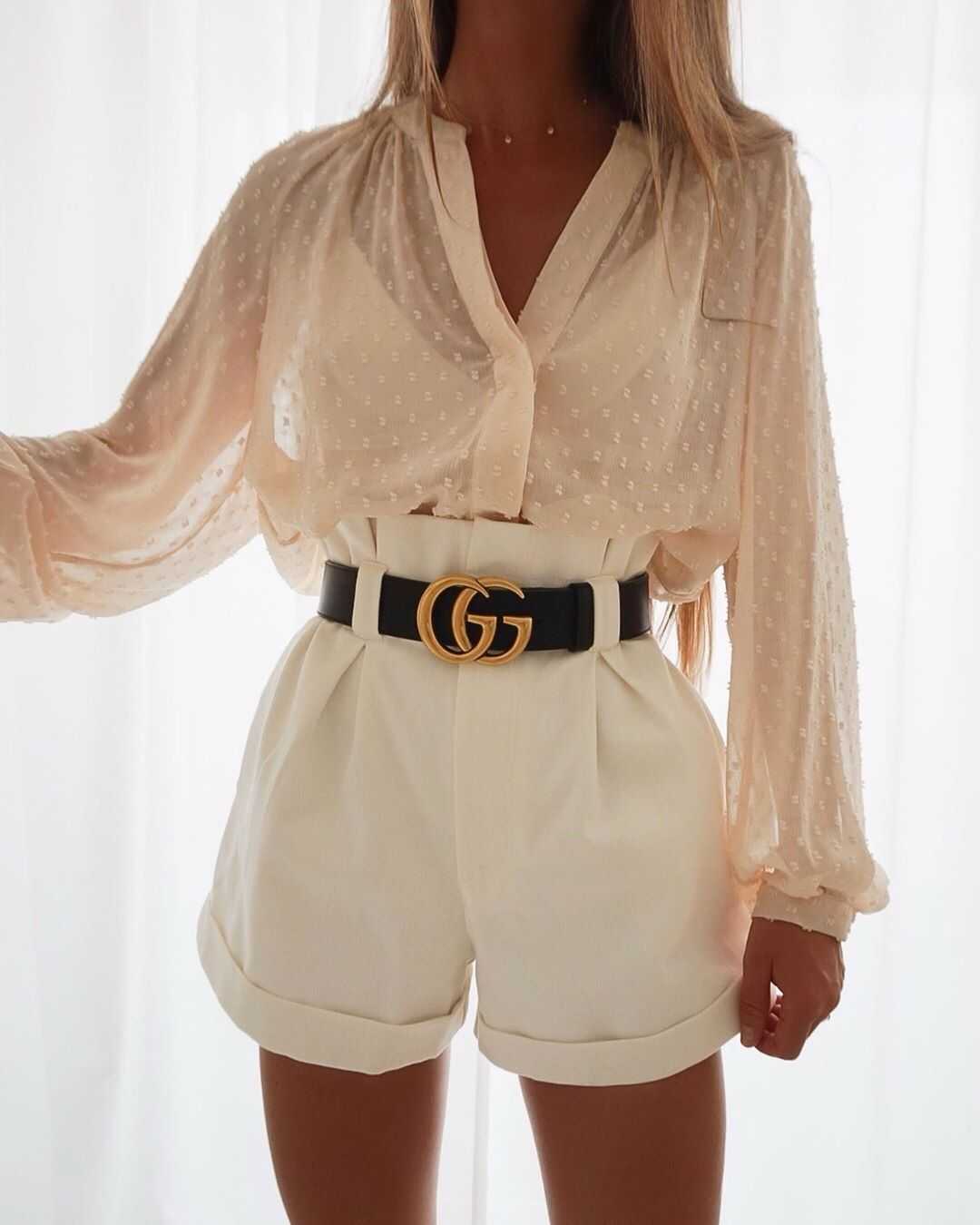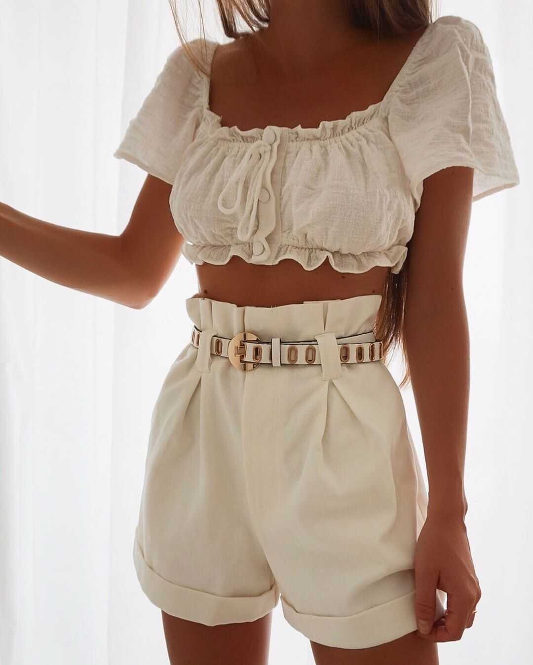 Завышенная талия с пояском актуальная не только для джинсовых шорт. В летнем сезоне 2021-2022 подобные фасоны шорт одни из самых изумительных и красивых моделек, образы с которыми смотрятся очень мило и привлекательно.