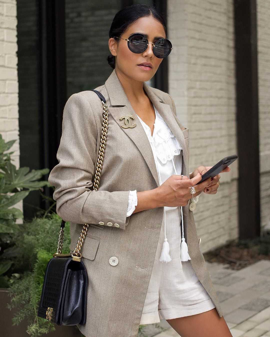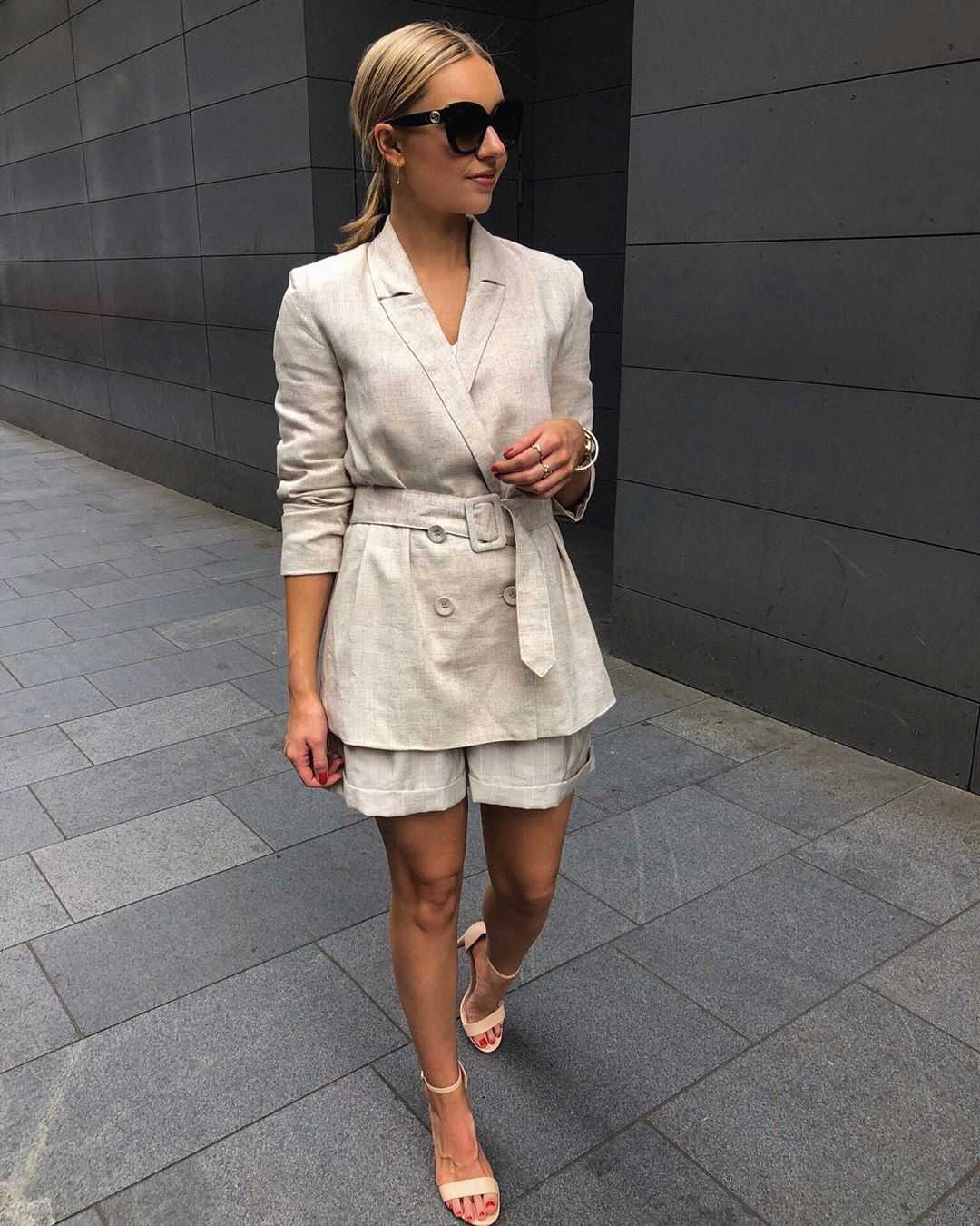 Для тех, кому нужен более официальный формат, дизайнеры предлагают стильные костюмы с шортами и удлиненным блейзером на лето. Среди них самые модные однотонные варианты комплекта строгого покроя.
