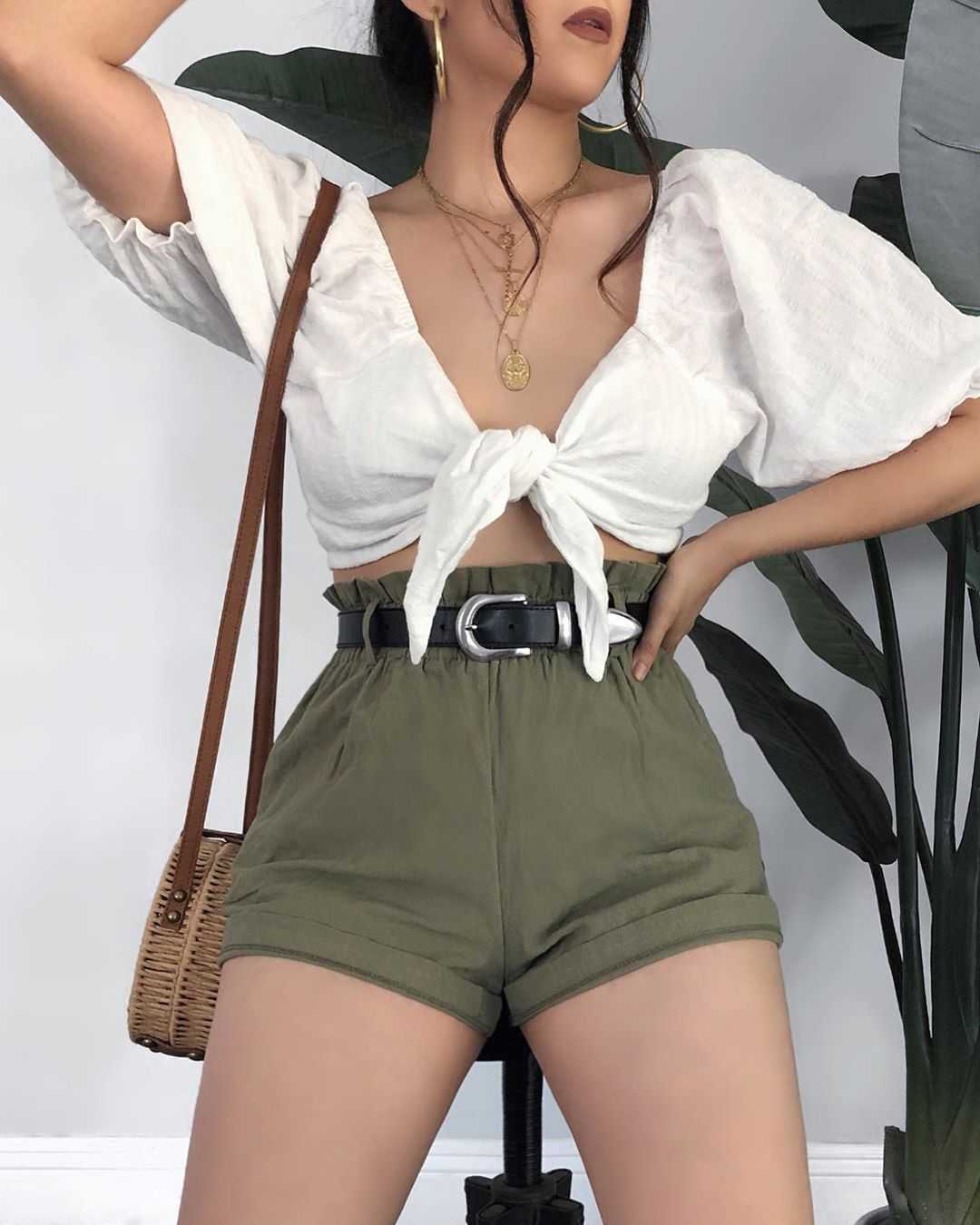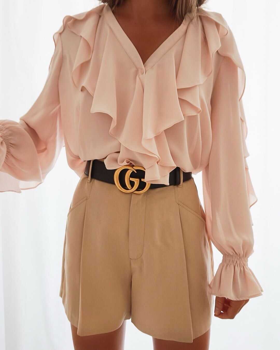 Самые актуальные модели подобных шорт имеют пояс на завязки, позволяющий варьировать внешний вид такого акцента. Вы можете сделать бант, узелок, или просто несколько раз обвязать талию. Красиво смотрятся и пояски с красивой лаконичной пряжкой-кольцом.