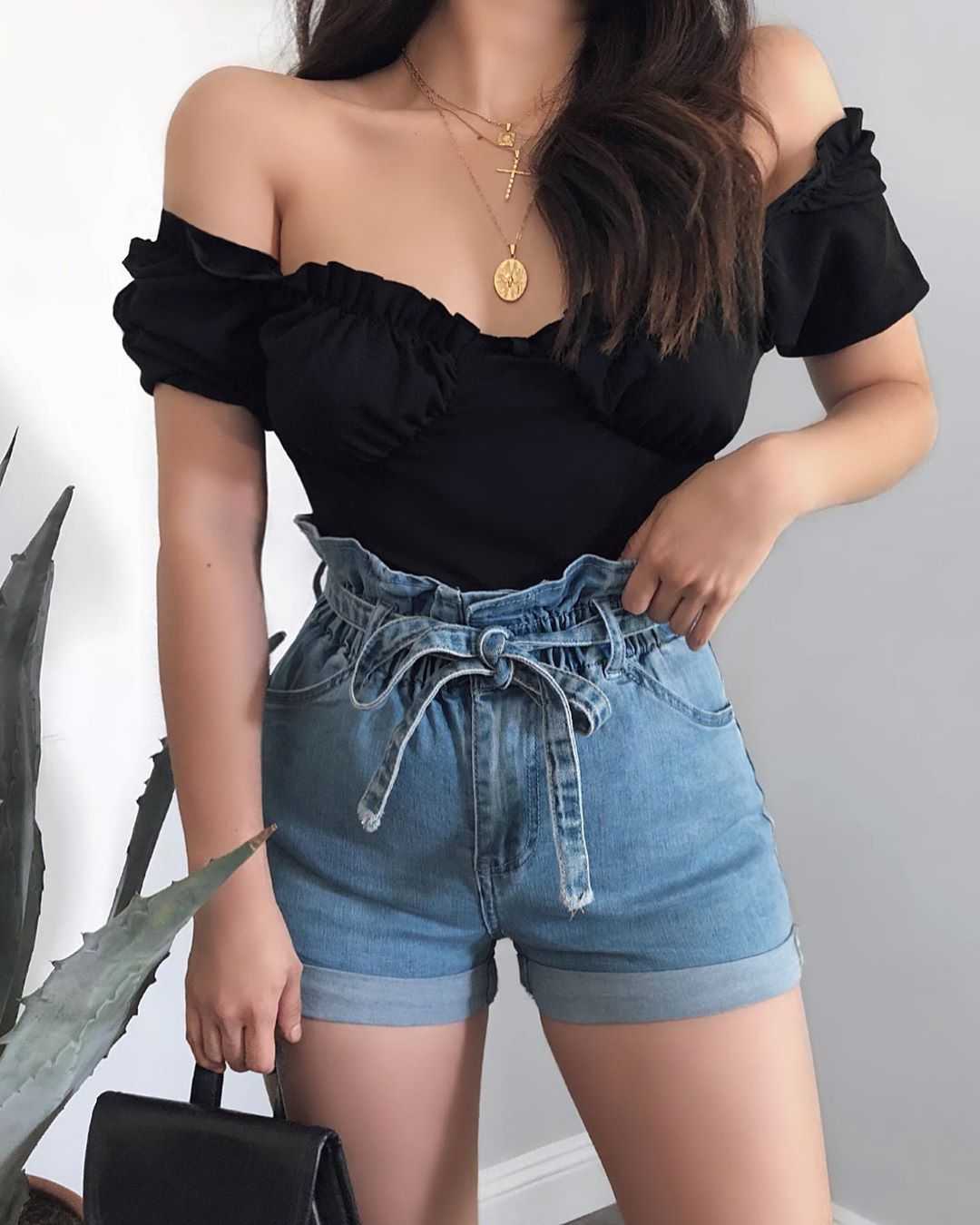 Актуальными модельками джинсовых шорт на лето 2021-2022 будут свободные фасоны средней и высокой посадки. В тренде необработанные края, модельки на пуговицы и даже шнуровку. Самые изящные джинсовые шорты — это модели с присборенной талией и джинсовым пояском.
