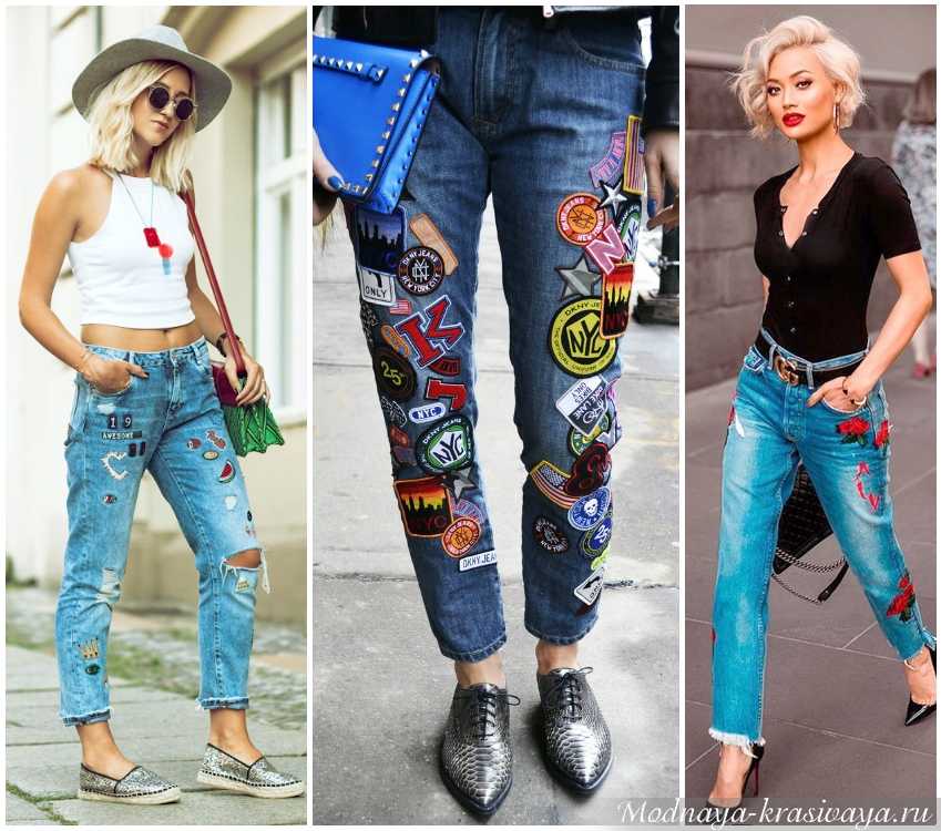 Интересны джинсы, декорированные вышивкой и всевозможными нашивками. Такие красивые джинсы помогают создать нежный и романтичный образ.