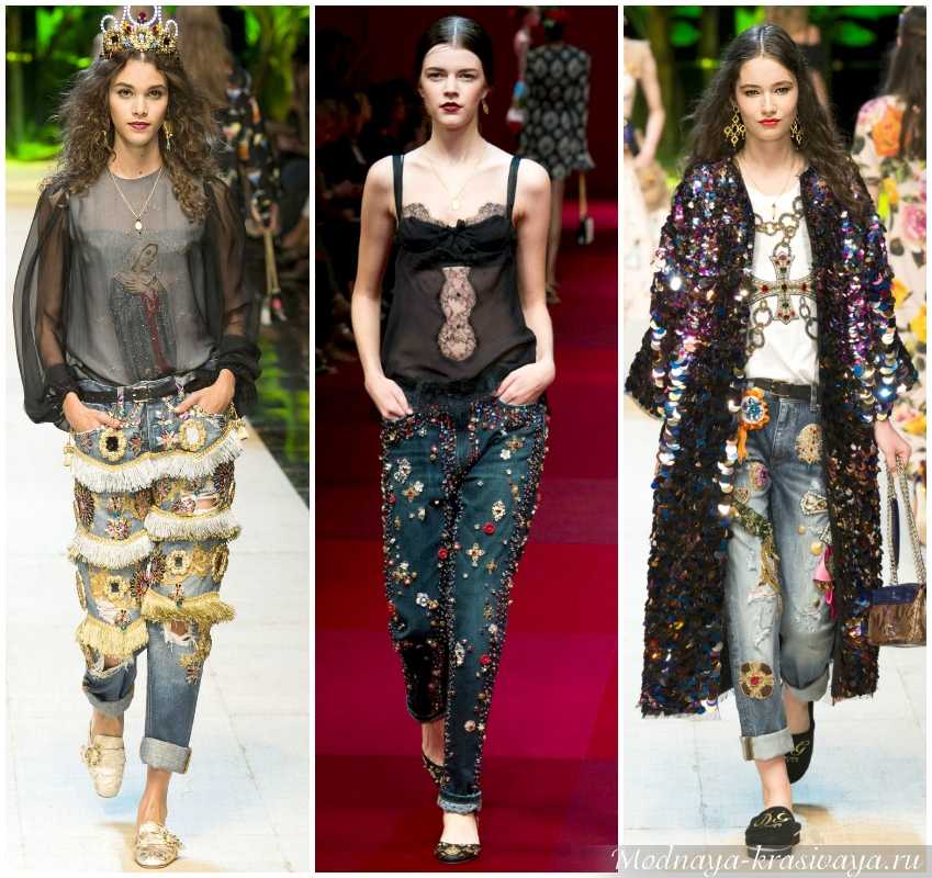 Дизайнерские дома превращают джинсы в составляющую нарядного и праздничного образа. Модельеры Dolce&Gabbana украсили свои новинки бахромой, бусинами и пайетками, металлической фурнитурой, превратив повседневную одежду в эффектный элемент, – в этом можно убедиться, взглянув на фото.