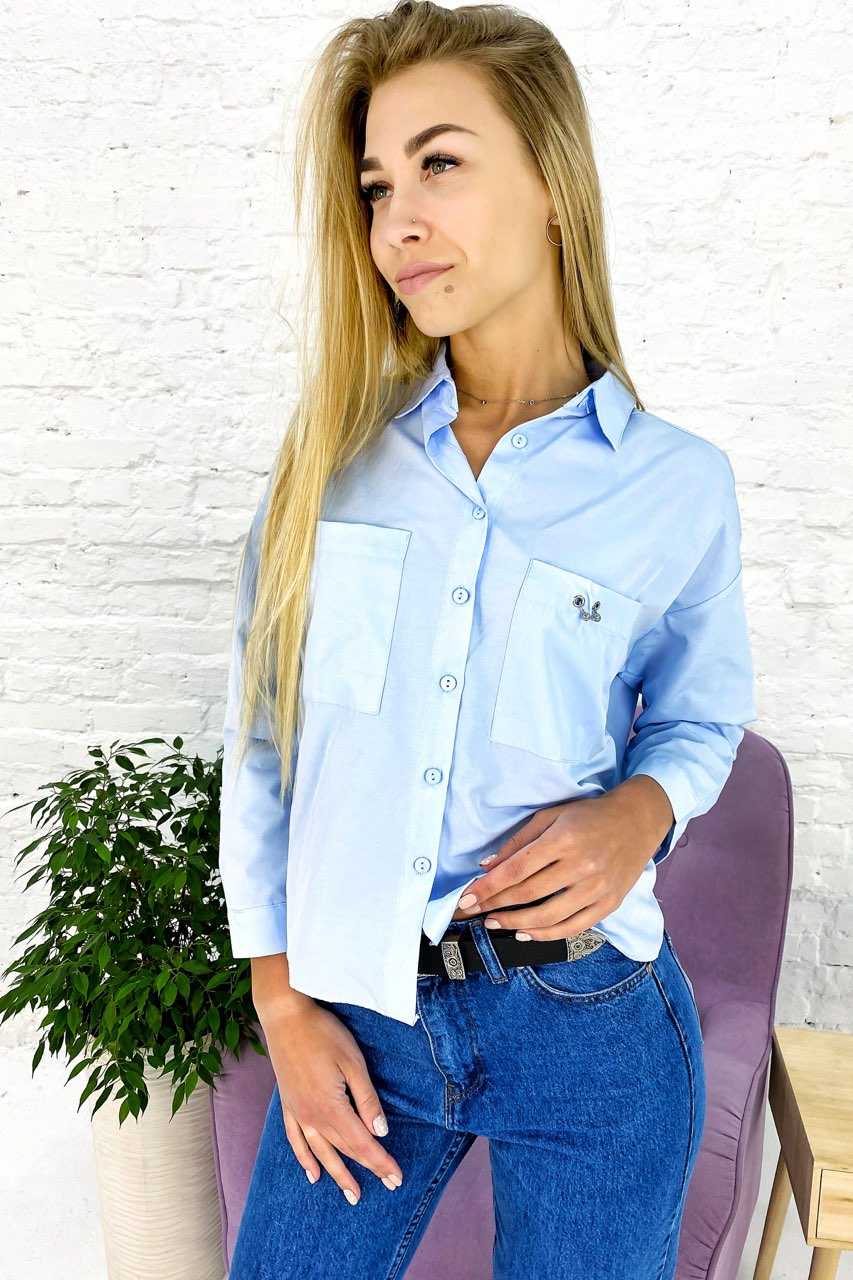 Обычная голубая рубашка женская дополняется необычными карманами, жабо, оригинальными манжетами, кружевом.
