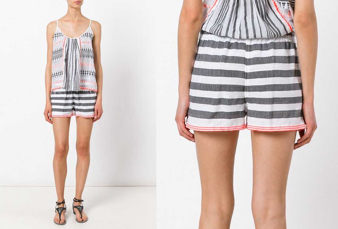 Еще один модный тренд, о котором стоит здесь сказать, – это комбинезоны с шортами. Плюс такого наряда в том, что вам не нужно отдельно подбирать верх и низ, ведь образ уже сразу получается целостным. В приведенном примере удачно дополнен соломенной шляпой и плетеной сумочкой.
