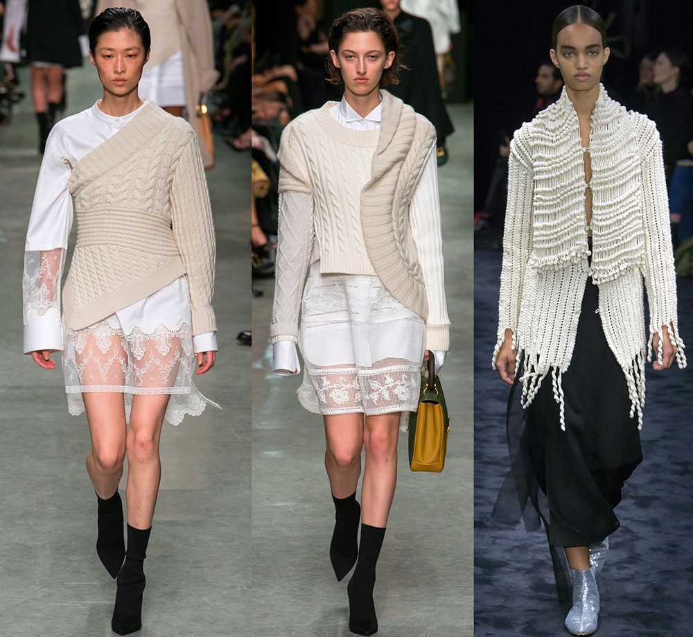 Что главное в свитере? Большинство согласятся – именно узоры вязания и соответственно необычная техника вязания. Какие виды использовали на этот раз дизайнеры? Возможно, вы о них первый раз слышите или даже видите? Например, вязание в технике энтрелак (часто произносят энтерлак), которое напоминает пэчворк, где лоскутки собраны в единое целое. Вязание в технике интарсия, бриошь или свинг также оказались представленными на подиуме.