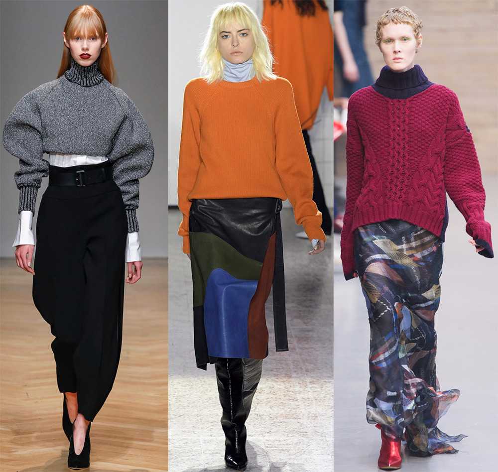 Объемные и короткие свитера, напоминающие кроп-топы, не спешат покинуть модный Олимп. Конечно, такой фасон вряд ли можно назвать подходящим для зимы, однако ситуацию исправляют стилистические решения, диктующие правила ношения укороченных свитеров. Оголенные пупки и вещи с низкой посадкой остаются в числе модных аутсайдеров и явных анти-трендов, так что дополняйте такой свитер брюками и юбками с максимально завышенной линией талии, или даже носите поверх облегающего платья-футляра.