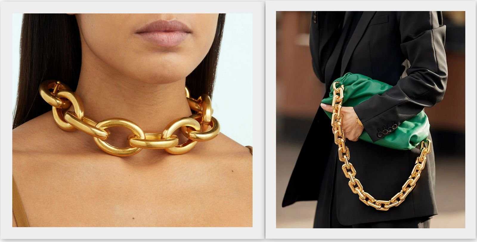 Сохраняют свою актуальность в женской моде 2021 и массивные цепи. Этот аксессуар можно увидеть не только на одежде, но и на шее и руках. Стилисты советуют не совмещать столь объемные цепи с прочими аксессуарами.