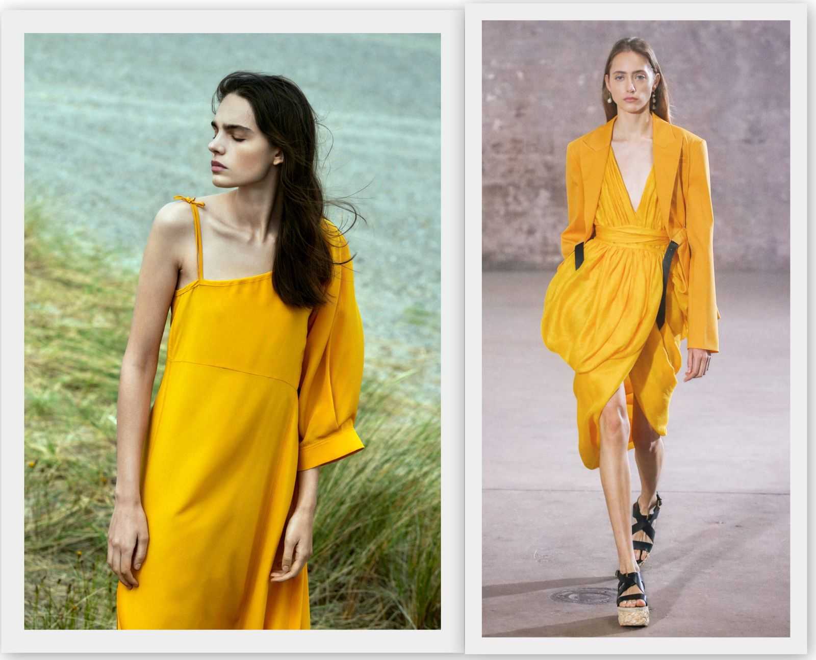 Прекрасный образ в желто-оранжевом стиле смогли представить модельеры от Altuzarra. Они пополнили модную коллекцию 2021 воздушным платьем с элементами драпировки. Образ завершает пиджак в нежно-оранжевом цвете.