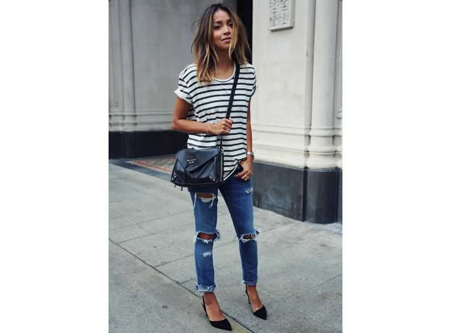романтический – брюки пастельной гаммы с белыми лампасами освежат нюдовые босоножки и кружевной верх. Под джинсы с кожаными вставками по бокам или легинсы из плотного трикотажа следует подобрать тунику фасона ампир, шифоновый балахон или многослойный топ на тонких бретелях. Эффектно выглядят хлопковые кофты на одно плечо или трикотажные свитера со спущенным плечом.