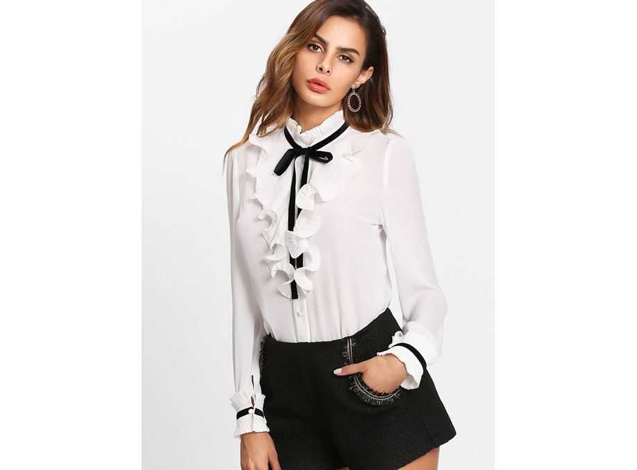 Для школьных занятий рекомендуется обзавестись белой водолазкой с кружевными или присборенными рукавами, стильной светлой блузкой с черным бантом, классическими темными брюками и сарафаном.