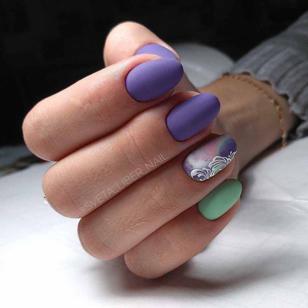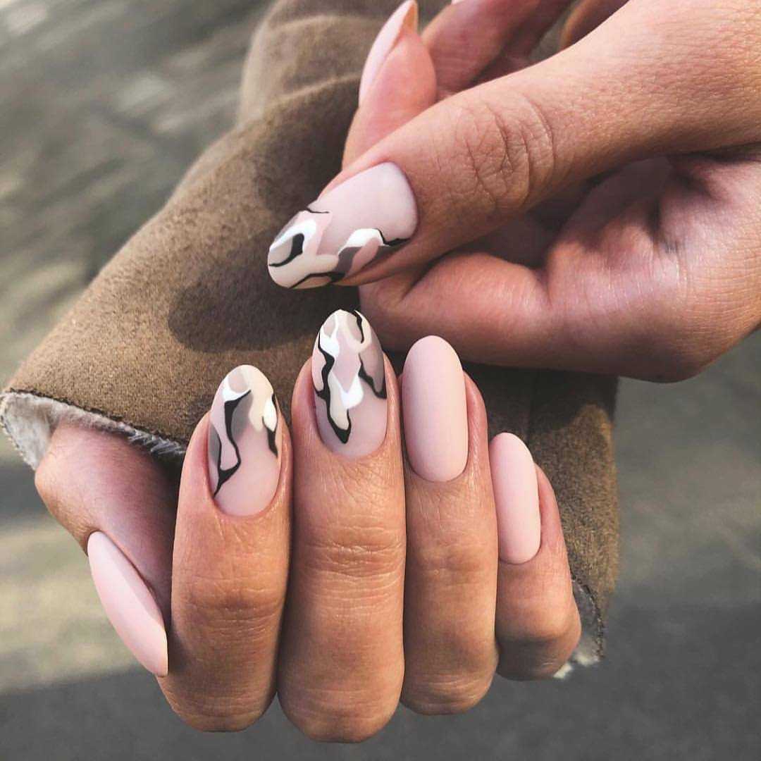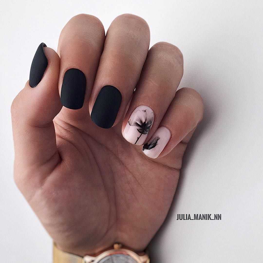 Матовый маникюр – универсальное решение на каждый день. Но как мы знаем, матовую текстуру обязательно нужно разбавлять ярким акцентом в виде узора, стразов, фольги, втирки. Предлагаем вам создать матовый дизайн с темным узором на полупрозрачном фоне. Такой маникюр выглядит современно и сдержанно. На фото-ниже вы можете видеть несколько примеров таких нейл-артов.