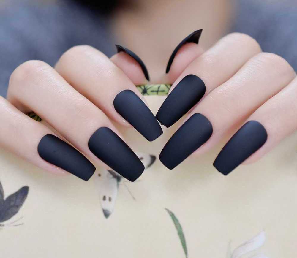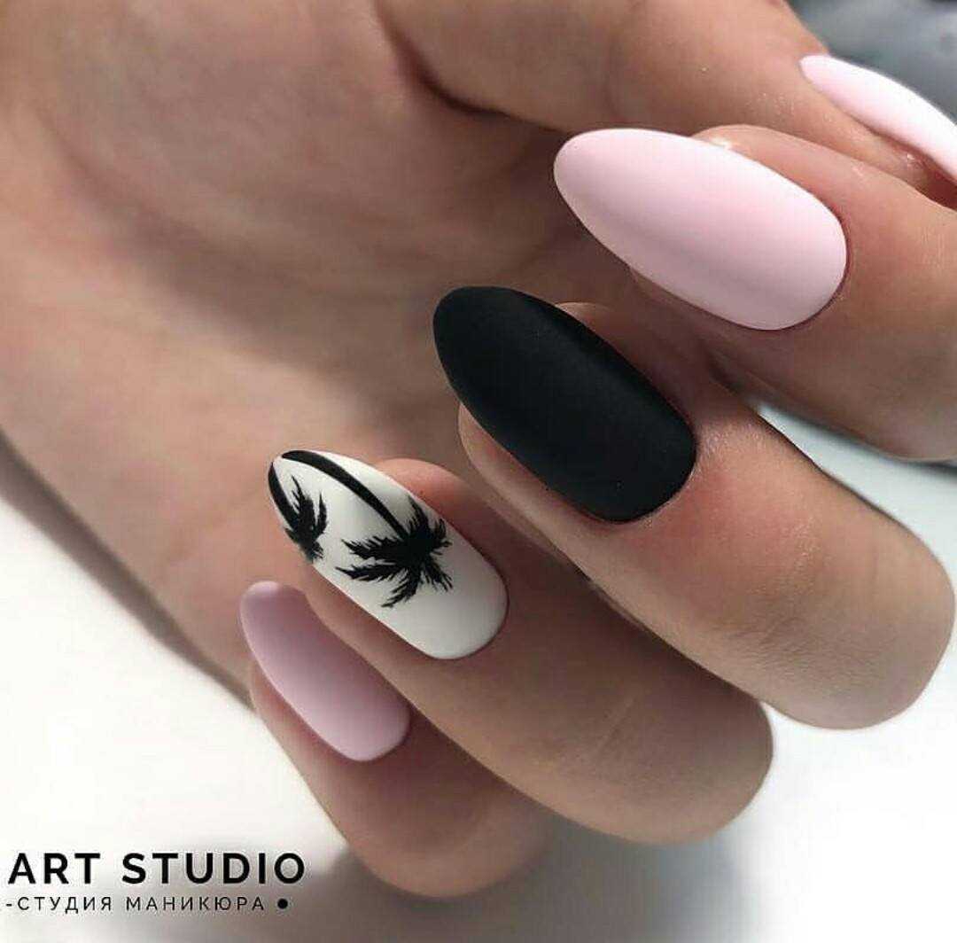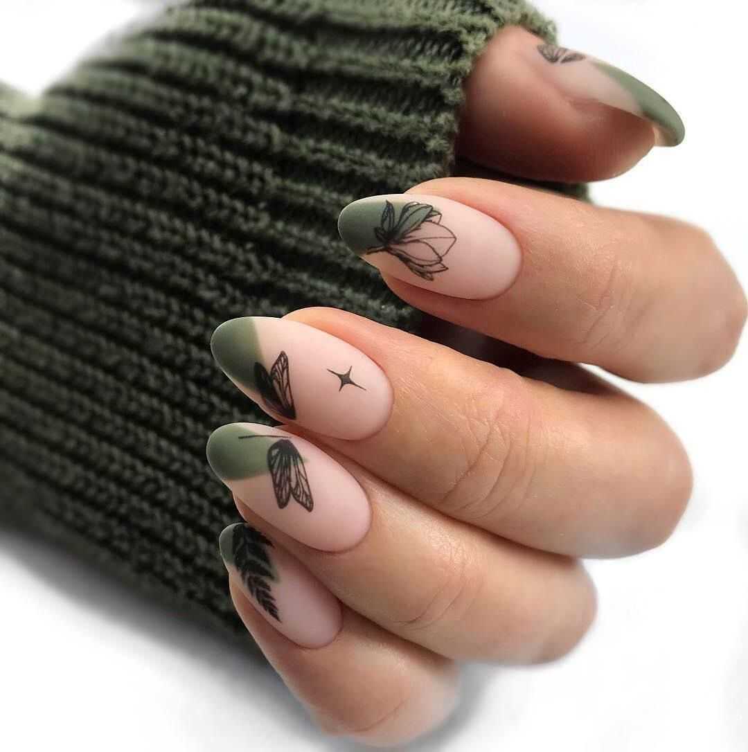 Матовый маникюр – универсальное решение на каждый день. Но как мы знаем, матовую текстуру обязательно нужно разбавлять ярким акцентом в виде узора, стразов, фольги, втирки. Предлагаем вам создать матовый дизайн с темным узором на полупрозрачном фоне. Такой маникюр выглядит современно и сдержанно. На фото-ниже вы можете видеть несколько примеров таких нейл-артов.