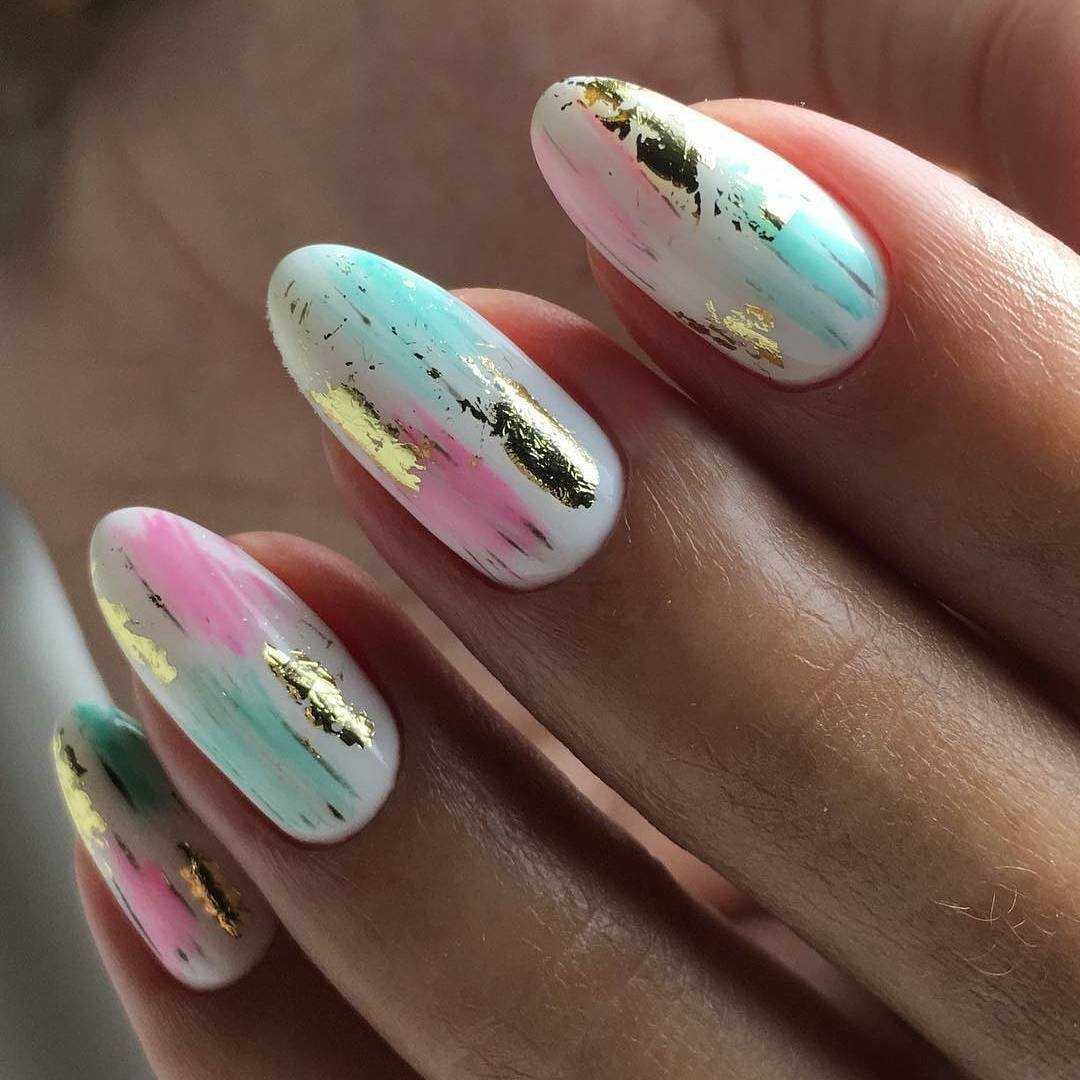 Дизайн с фольгой идеально подойдет для потрясающих вариантов зимнего маникюра. В сезоне 2020-2021 отдавайте предпочтение не только топовым вариантам фольги — золотой и серебристой, выбирайте также разноцветную, она шикарно смотрится с пастельными цветами лаков.