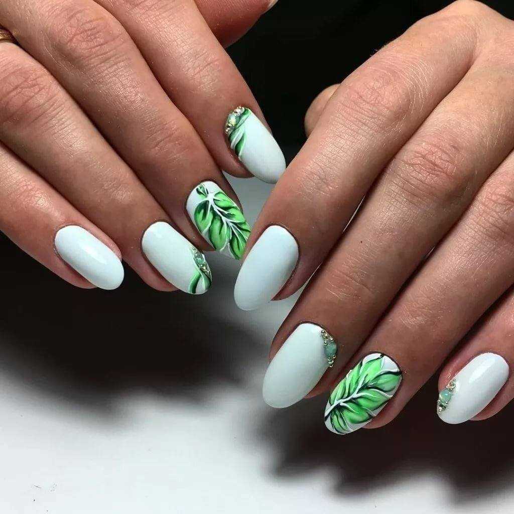 Дизайн заслуживает того, чтобы на него обратили внимание, ведь он кардинально отличается от привычной флористики и геометрии. Для летнего сезона подберите для себя варианты белого маникюра с листьями монстеры, серебряным глиттером, темной геометрией