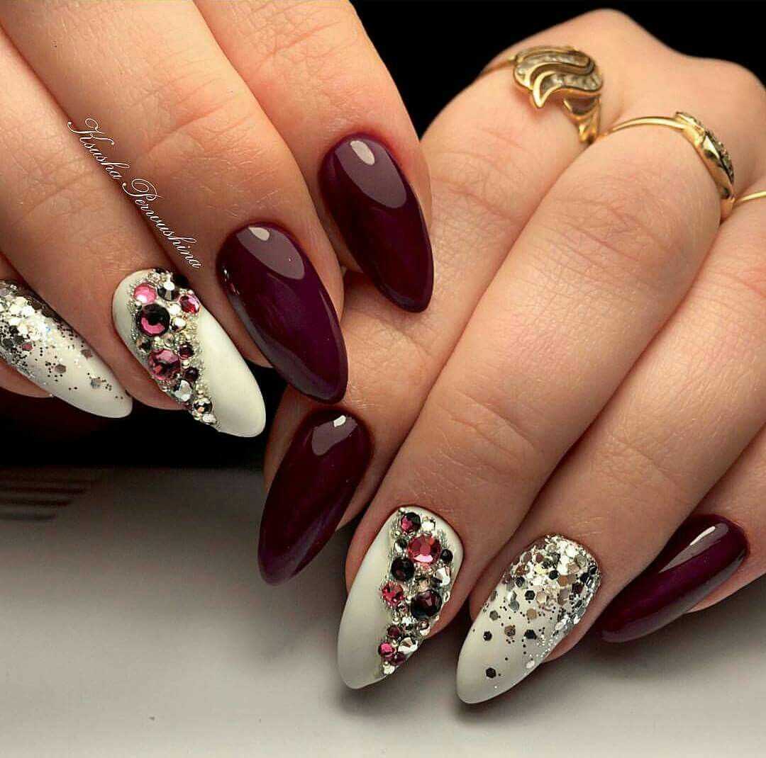 Белый вариант — отличный вид нейл-арт на Новый год. Особенно роскошно он будет смотреться в матовом исполнении с дополнением из страз и серебристых блесток, нанесенных по принципу градиента. В качестве декора можно использовать наклейки и рисунки. Прекрасно дополнит дизайн принт горошком или клеткой.