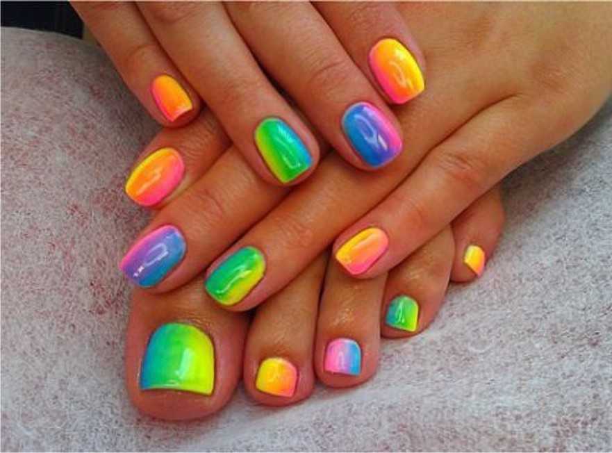 Теплые, солнечные дни наполняют энергией и хорошим настроением. Хочется сделать яркий маникюр, быть в центе внимания, съездить на пляж, для этого и ждешь лето. В моде разноцветные неоновые ногти, они могут быть глянцевыми или матовыми, или в стиле «разные руки». Комбинирование оттенков подбирается под цвет купальника, настроения, любых других пожеланий девушки. Форма ногтей, длинна должна быть в первую очередь удобна для своей обладательницы, и конечно же нравится ей.