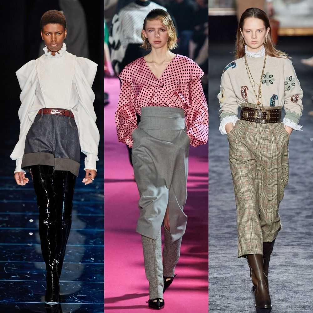 На радость поклонникам 80-х годов прошлого века, брюки с завышенной посадкой задержатся в трендах еще на несколько сезонов. Фасон не важен: широкие палаццо, карго в стиле милитари или бойфренды из денима – дизайнеры предлагают делать акцент на талии еще более выраженным с помощью широких кожаных ремней или атласных поясов от смокингов, позаимствованных в мужском гардеробе.