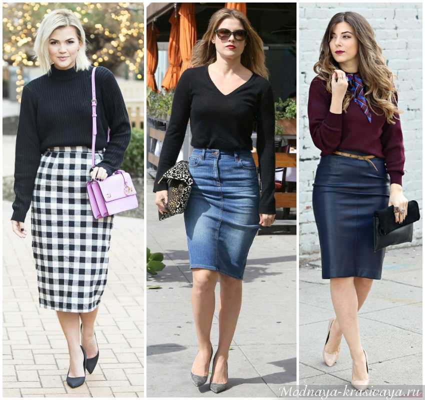 Второй удачный фасон – юбка-карандаш из плотной ткани той же длины, что и в первом случае. Зауженный подол сделает бедра более изящными. Начинаться юбка должна либо на талии, подчеркивая ее, либо выше – такая модель визуально удлиняет нижнюю часть фигуры, делая ее гармоничной.