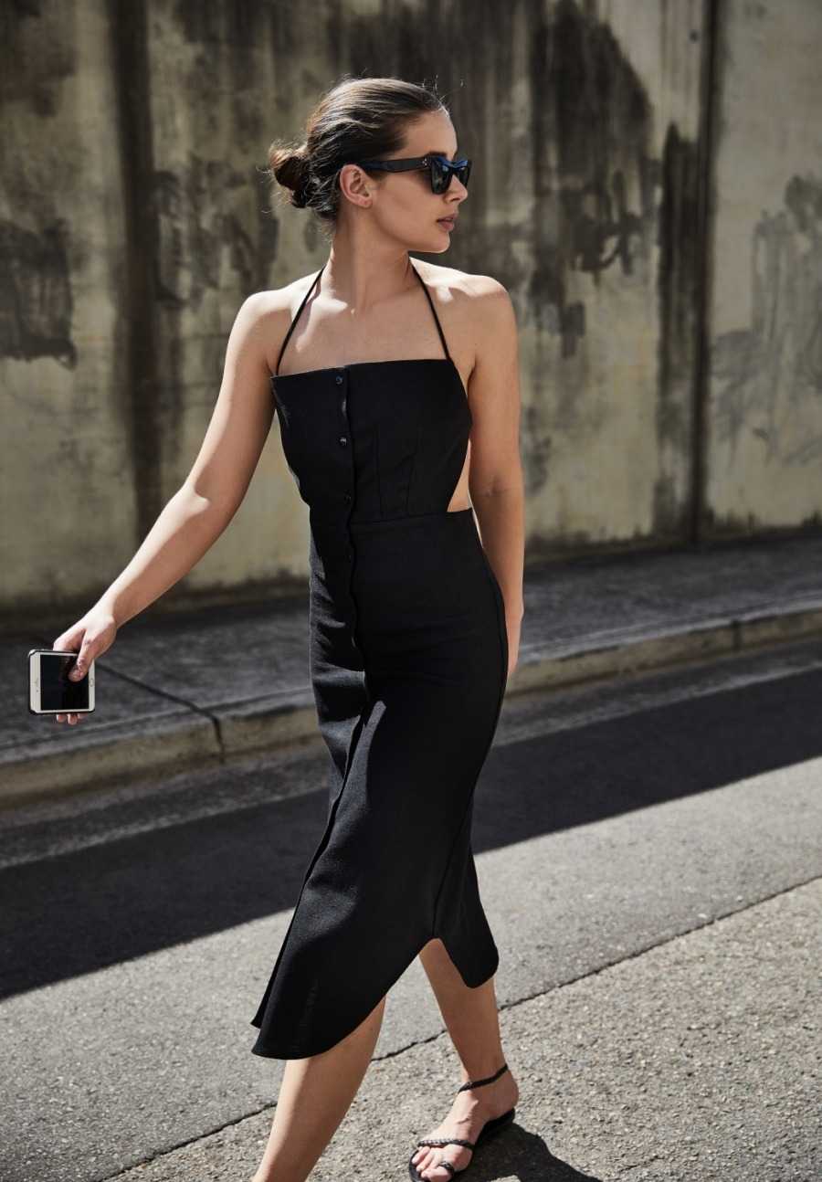 В таком льняном платье можно и в пир, и в мир и добрые люди. Особенно, если заменить обувь на более изящную шпильку и добавить к этому образу клатч. Однако стоит внимательно отнестись к контексту мероприятия. Все-таки открытые спина и плечи подразумевают свободный формат мероприятия в кругу знакомых. Поэтому в качестве аутфита на коктейльную вечеринку у бассейна – да, для более серьезных мероприятий – нет, или с укороченным жакетом с максимумом натуральных тканей.