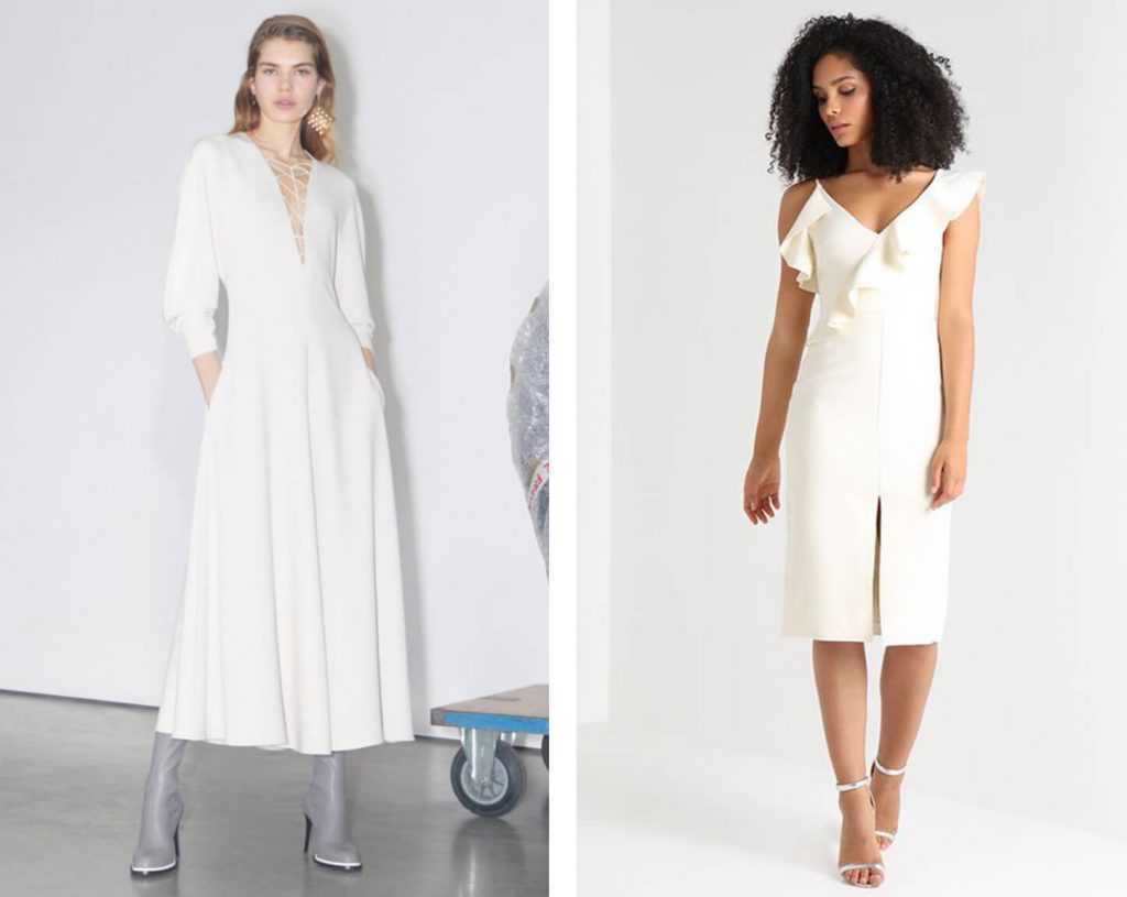 Белые платья — ещё одна новогодняя классика. Они ассоциируются с чистотой и мягким нетронутым только что выпавшим снегом. Чтобы не быть похожей на невесту, выбирайте модели а-силуэта и оверсайз варианты. Избегайте излишнего блеска и остановите свой выбор на плотных матовых тканях, мини или миди длине и контрастных аксессуарах.