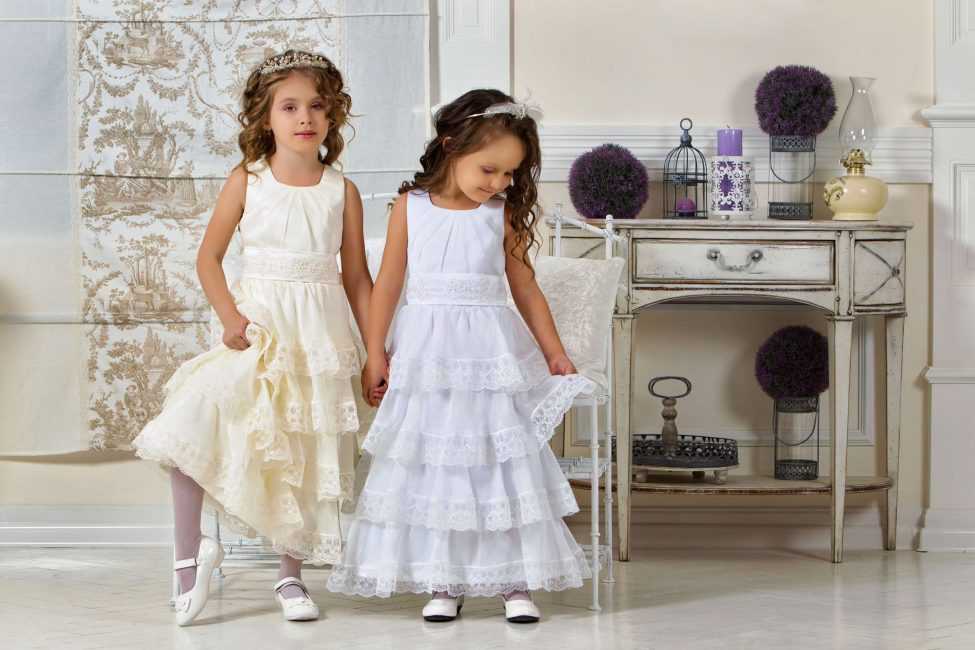 - В моде кружевные платья А-силуэта – модель может быть без рукавов или с красивыми рукавчиками. Приталенная модель с пышной юбкой смотрится нарядно, такой наряд можно украсить красивым поясом, отделанным лентой, завязанным сзади бантом. Завышенная талия наиболее подходит для маленькой девочки. Покрой очень удобен, платье не сковывает движения и позволяет девочке бегать и играть. Длину платья тоже можно выбрать любую, но для девочки будет больше подходить вариант – миди.