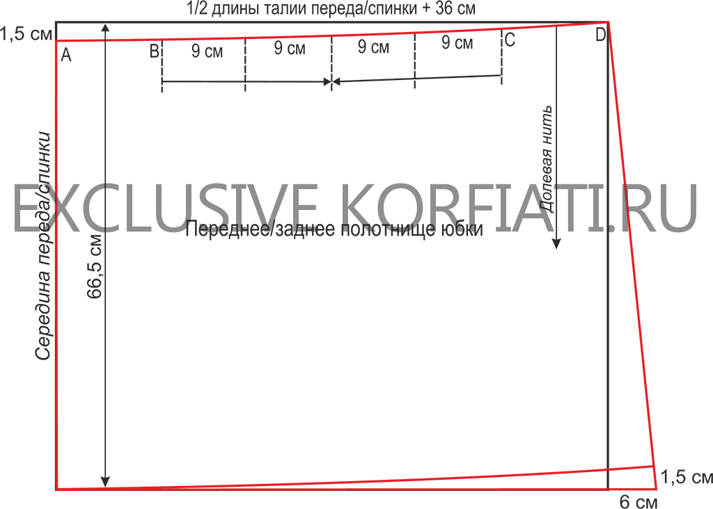 Постройте прямоугольник шириной равной ½ длины талии переда/спинки + 36 см на встречную складку и длиной 66,5 см. Длина юбки в готовом виде – 65 см. От левого верхнего угла прямоугольника отложите вниз 1,5 см – точка А. Затем от точки А отложите вправо АВ (мерка по переду/спинке платья), затем отложите 36 см (прибавка на встречную складку) и мерку CD (мерка по переду/спинке платья).