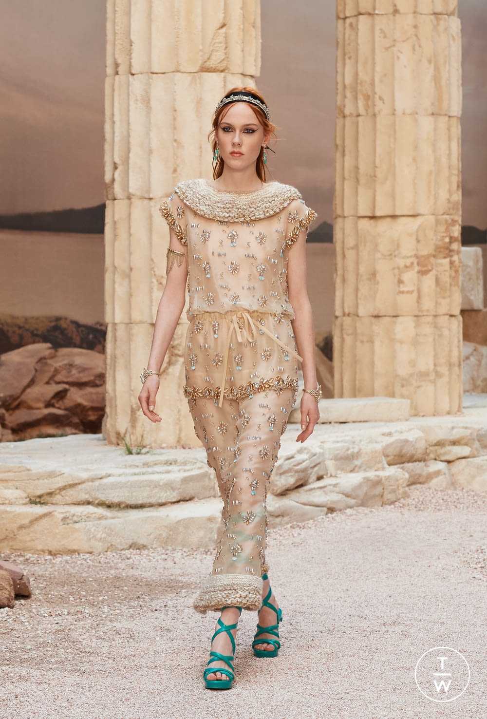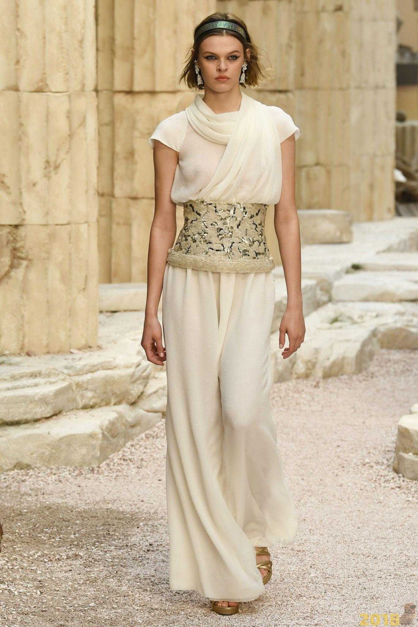 Особенной фишкой коллекции от Карла Лагерфельда стали украшения для волос, которые переживают очередную волну фэшн-популярности. Вполне естественно, что тематическая коллекция дома Шанель потребовала аутентичного декора для причесок моделей. Выбор был очевиден – ободки с золотыми листами лавра и роскошные золотые повязки с крупными камнями, в которых не постеснялась бы выйти в свет жена любого греческого императора.